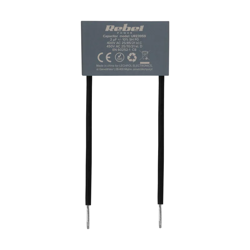 The Rebel URZ3959 is a high-reliability MKSP-8 series metallized polypropylene film capacitor designed for AC circuit applications. It is specifically engineered to facilitate the starting and stable operation of single-phase asynchronous electric motors.
