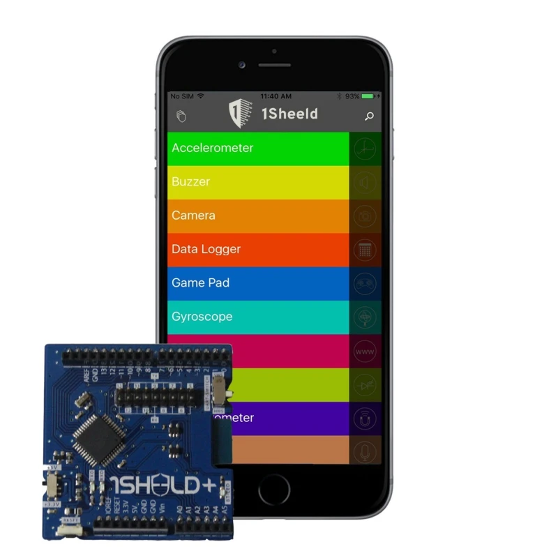 The 1Sheeld+ is an easily configured shield for Arduino. It has a built-in bluetooth low energy module that gives to your Arduino the capability to connect itself to your iOS and Android phones. Thanks to the 1Sheeld app available on the App Store and Google Play Store you can easily associate your Android smartphone to it and turning your smartphone in a shield itself.
