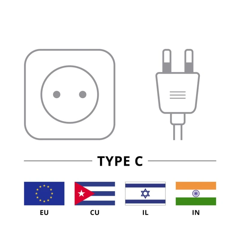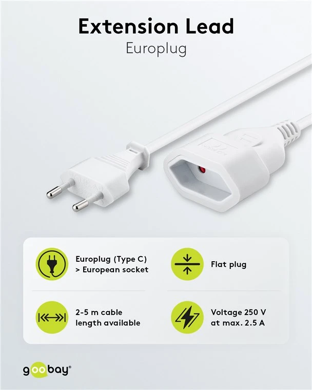 - Equipped with a Euro plug (Type C, CEE 7/16) on one end and a matching Euro socket (Type C, CEE 7/16) on the other.