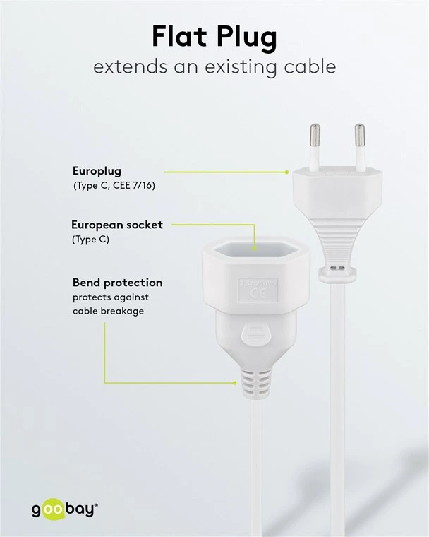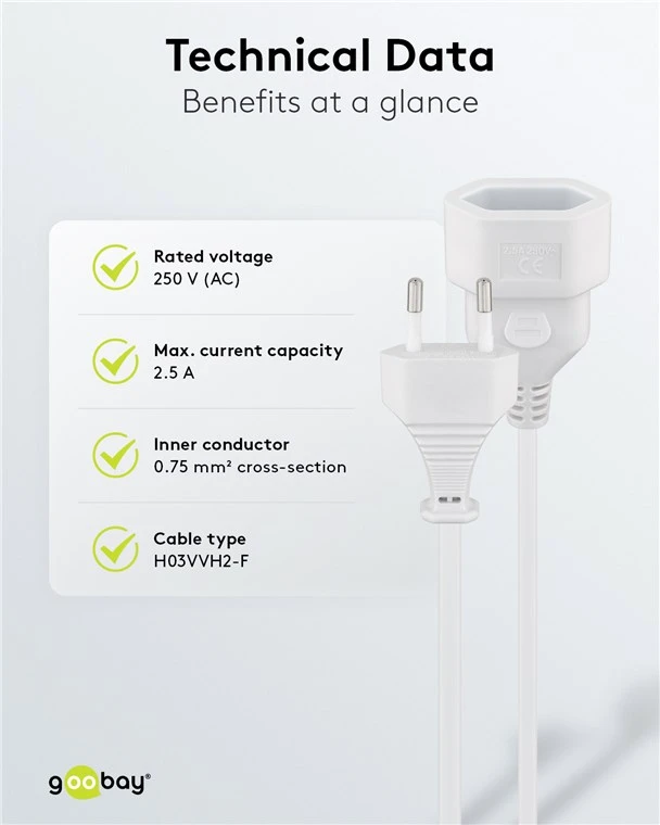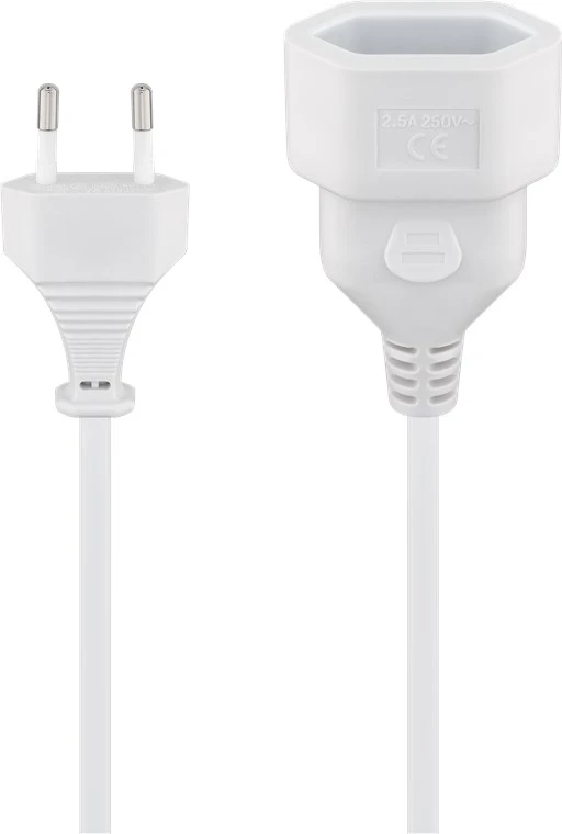 The Goobay 51356 is a 2-meter white Euro extension cable, designed to extend the reach of power cords for devices equipped with a Euro plug. It features touch protection for enhanced safety. Key Features