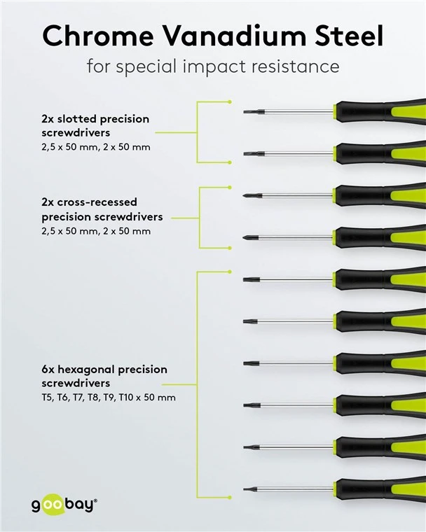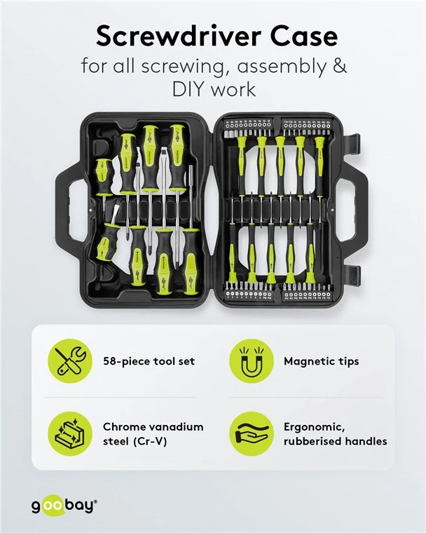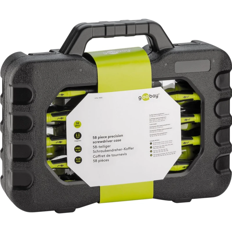 The Goobay 74005-GBY 58-piece Precision Screwdriver Set is a versatile and durable kit designed for detailed assembly, repair, and general DIY projects. This comprehensive set provides essential tools for precision work, housed in a robust, compact storage case.