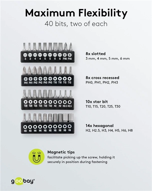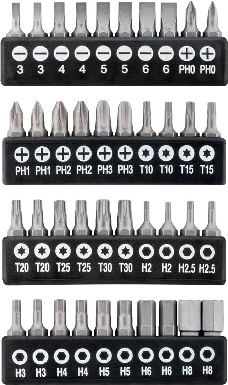 Bits (40x, 2 pcs of each size): 8x Slotted (3 mm, 4 mm, 5 mm, 6 mm), 8x Phillips (PH0, PH1, PH2, PH3), 10x Torx (T10, T15, T20, T25, T30), 14x Hex (H2, H2.5, H3, H4, H5, H6, H8)