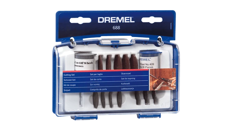 A selection of 68 cutting discs in a convenient box. A removable accessory tray and 3 dividers provide an ideal storage solution. The Dremel leaflet explains the included accessories.