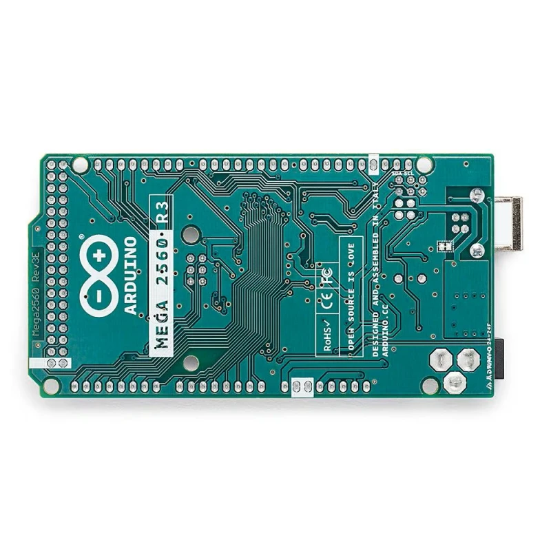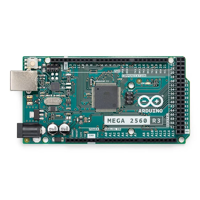 The Arduino Mega 2560 Rev3 is a microcontroller board based on the ATmega2560. It has 54 digital input/output pins (of which 15 can be used as PWM outputs), 16 analog inputs, 4 UARTs (hardware serial ports), a 16 MHz crystal oscillator, a USB connection, a power jack, an ICSP header, and a reset button.
