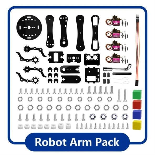 The Acebott QD007 Robotic Arm Expansion Set converts the ACEBOTT QD001 ESP32 Smart Robot Car base kit into a fully functional, intelligent robot manipulator. Built on the open Arduino platform and utilizing the ESP32 microcontroller, this kit is engineered for advanced programming and precise control.