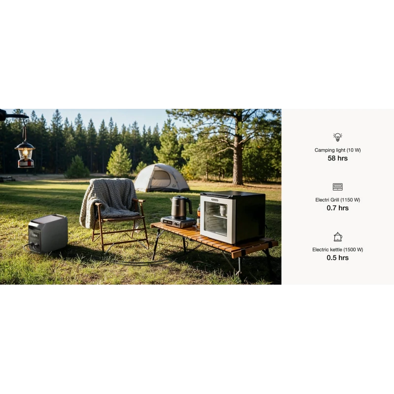 The 1800 W continuous output allows you to run high-power devices such as kettles, microwaves, and coffee machines. The 1 kWh capacity is also suitable for powering computers, routers, NAS systems, TVs, or refrigerators. X-Boost mode supports devices up to 2600 W.