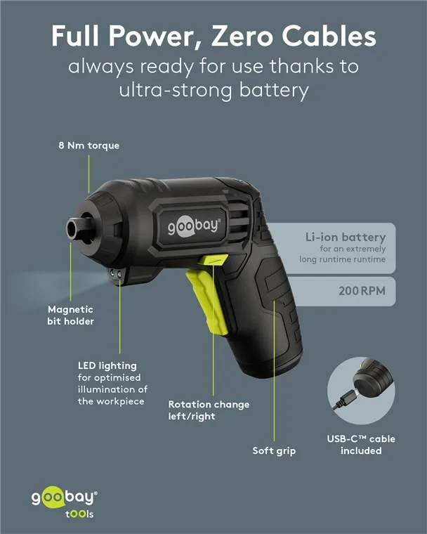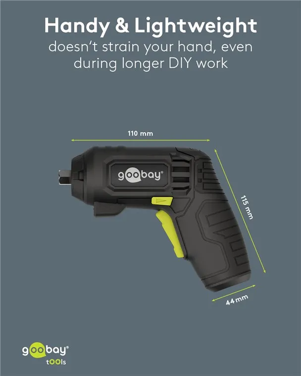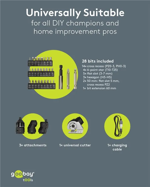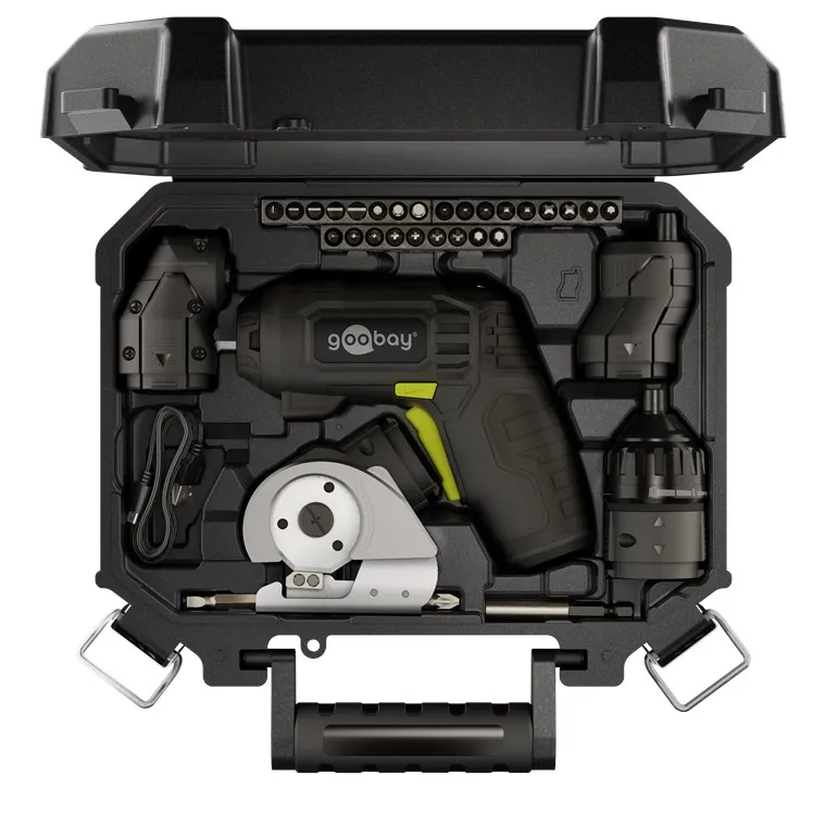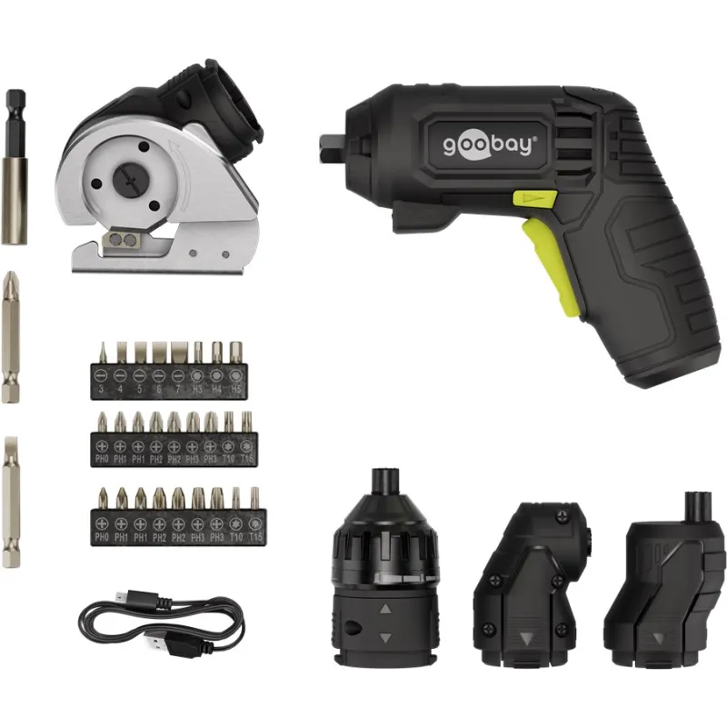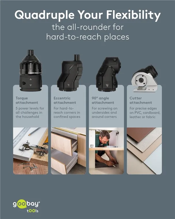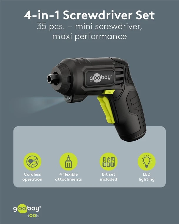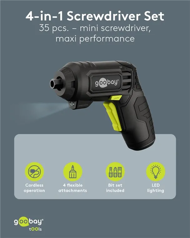 The Goobay 77817 is a versatile 4-in-1 cordless mini screwdriver designed for furniture assembly, household repairs, and DIY projects. It features a modular design with four specialized attachments to handle a wide range of tasks in confined or challenging spaces.