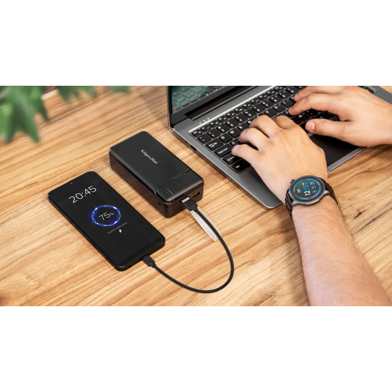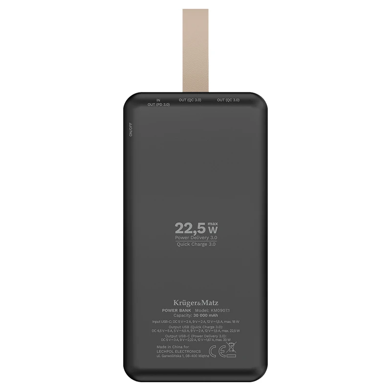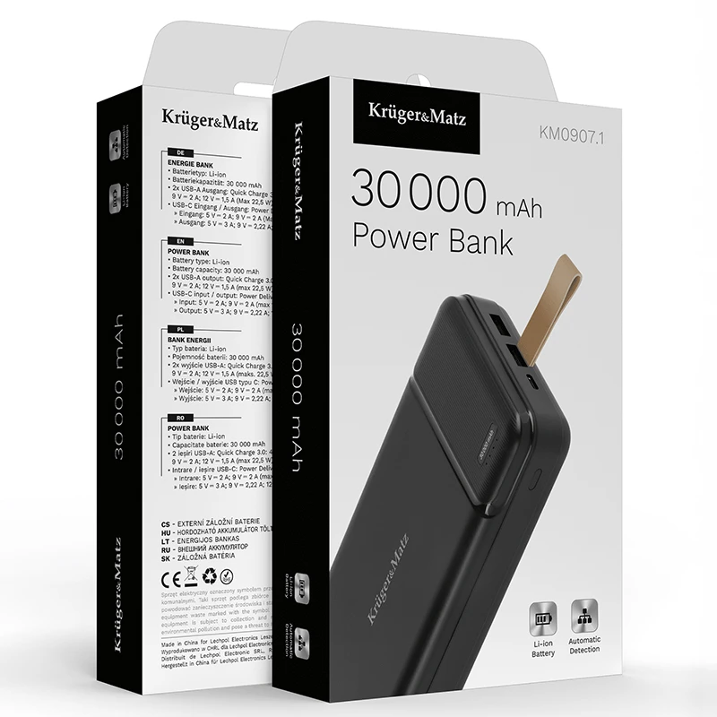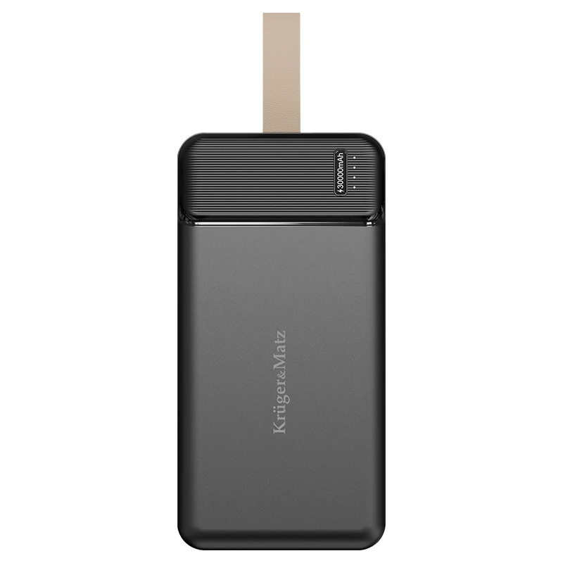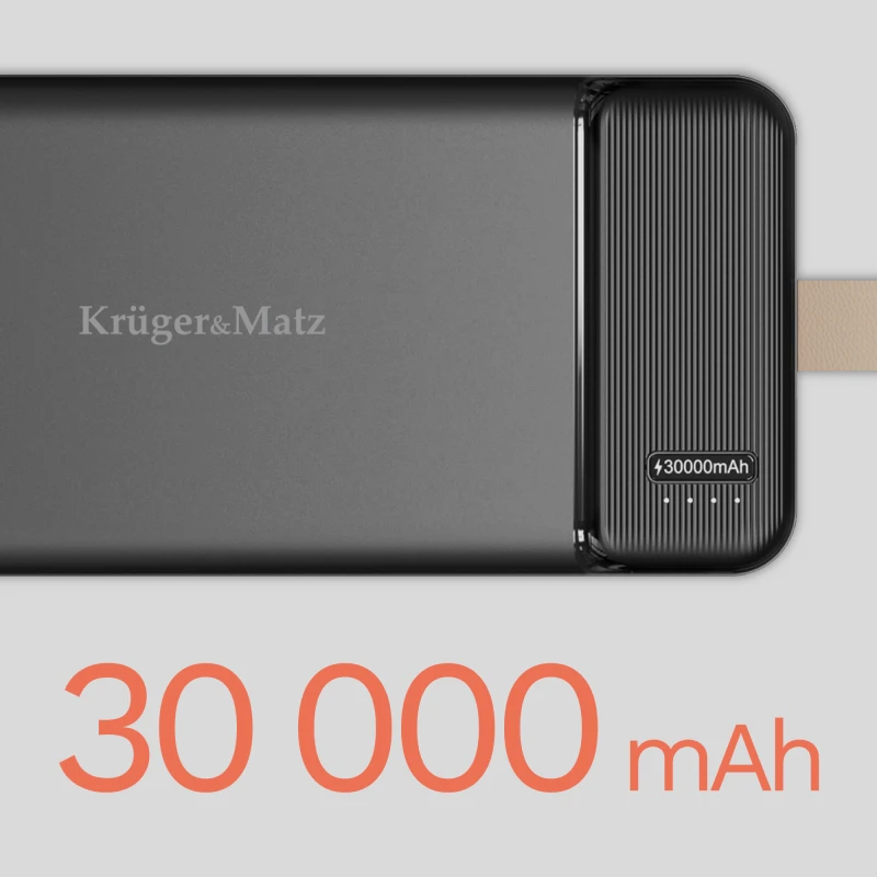 The Kruger&Matz KM0907.1 Power Bank is a high-capacity, independent power source designed to provide reliable energy for modern devices. Featuring a 30,000 mAh Lithium Polymer battery, it supports the simultaneous fast charging of up to three devices.