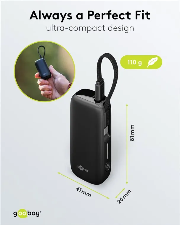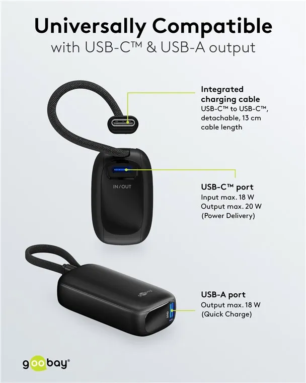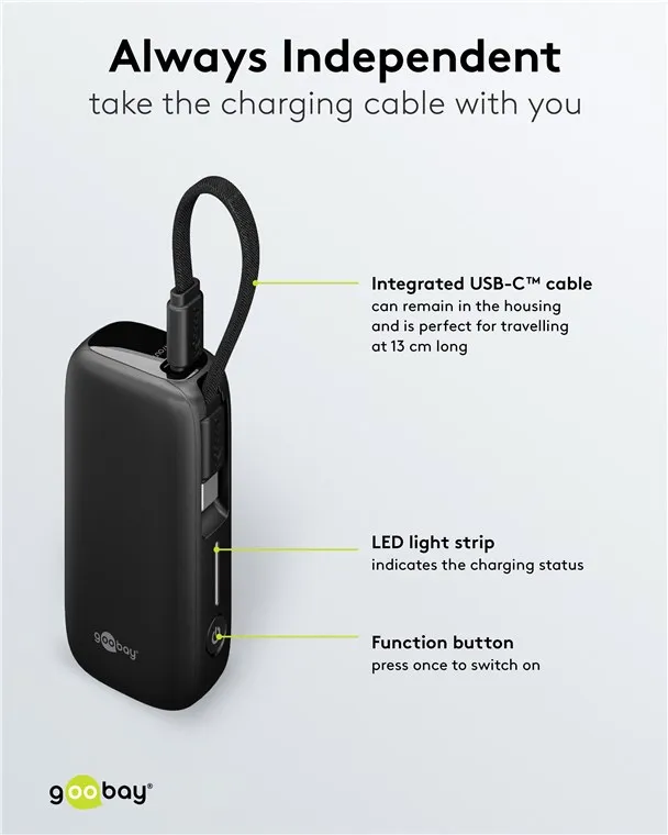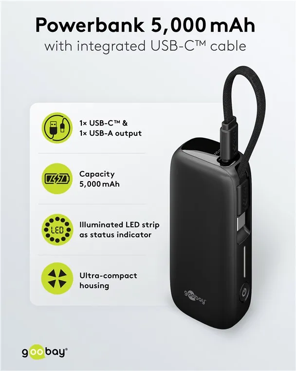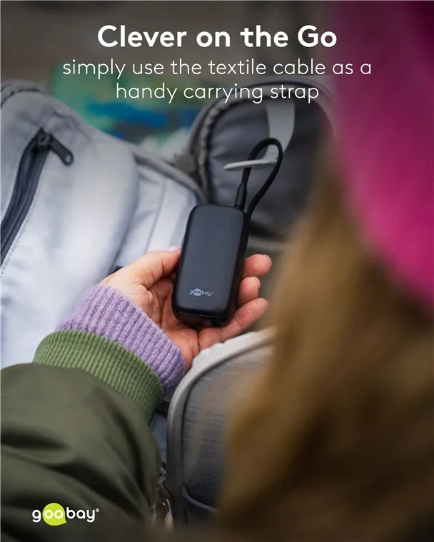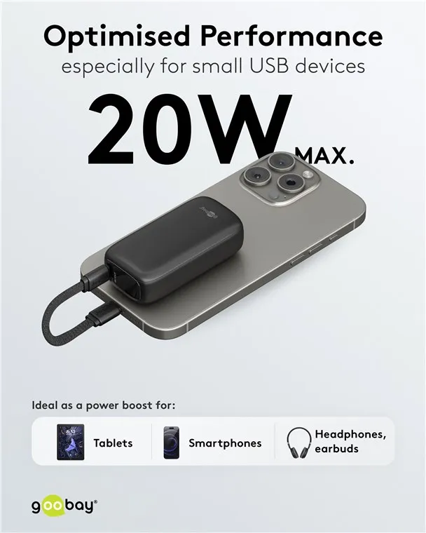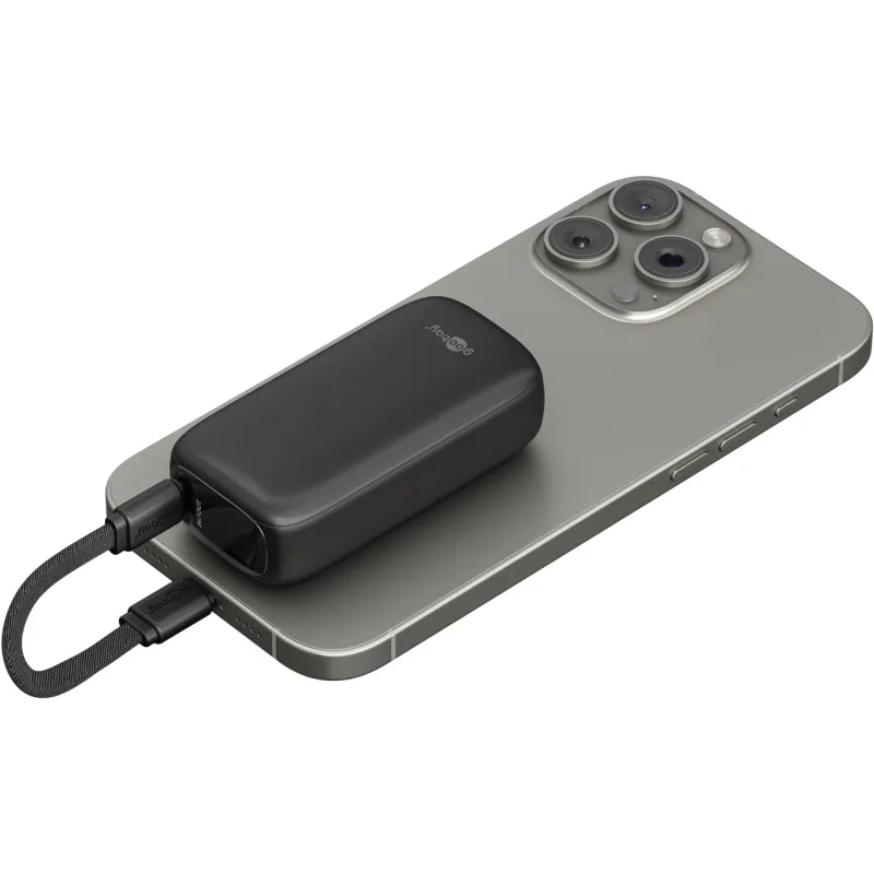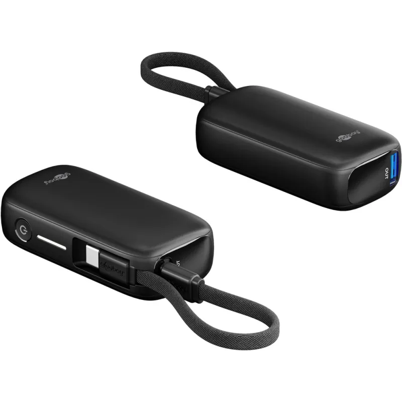 This compact and lightweight Goobay external battery (power bank) offers 5000 mAh capacity and PD20W fast charging, featuring a convenient integrated USB-C cable.