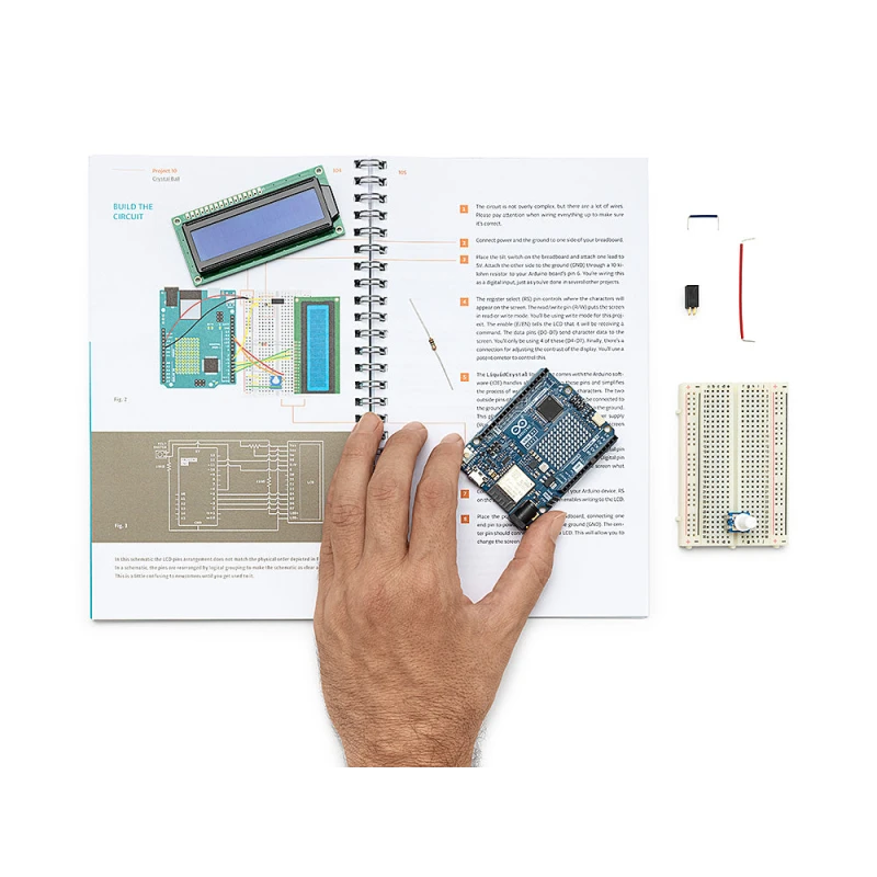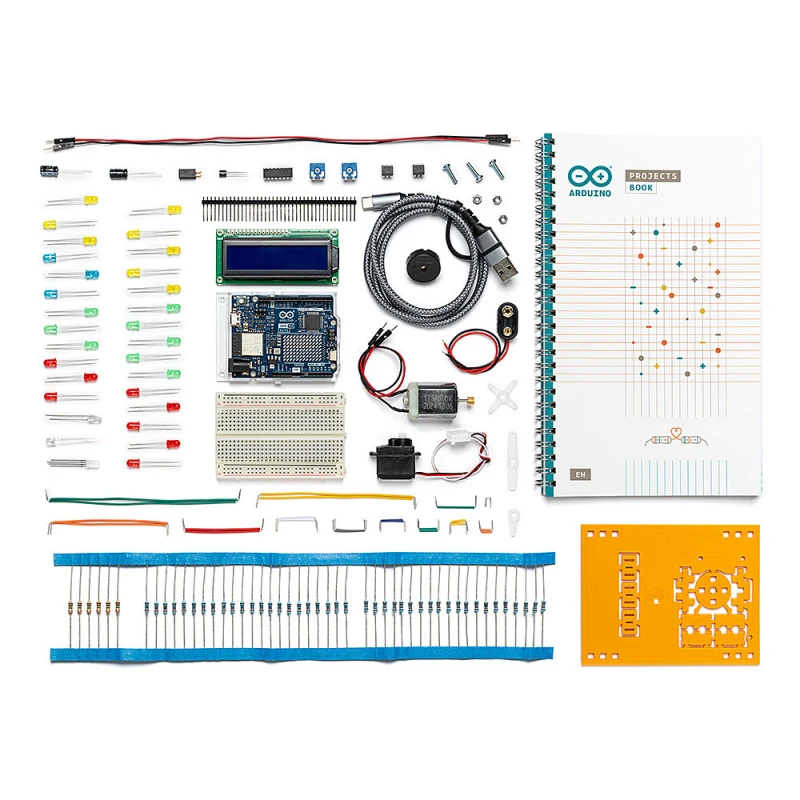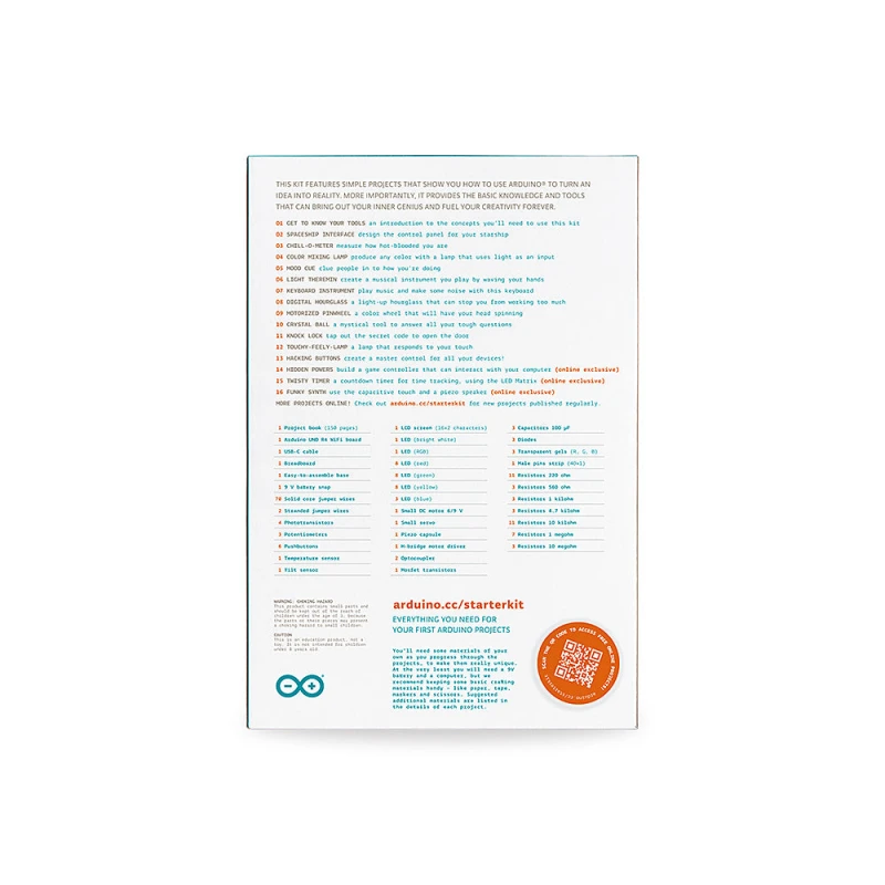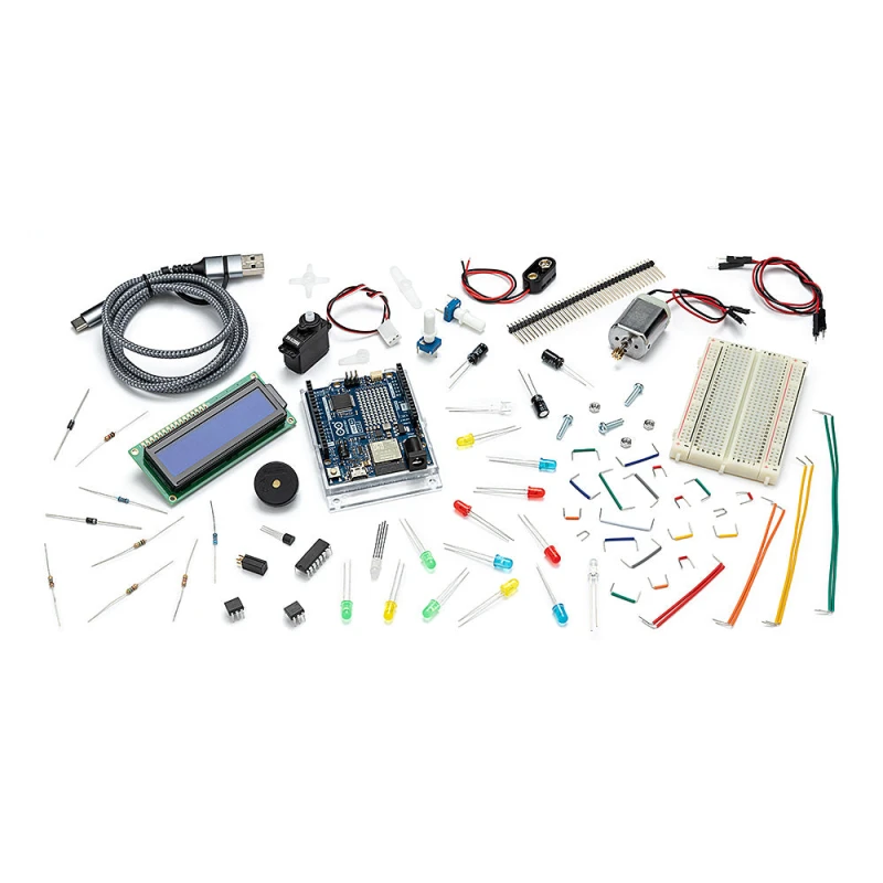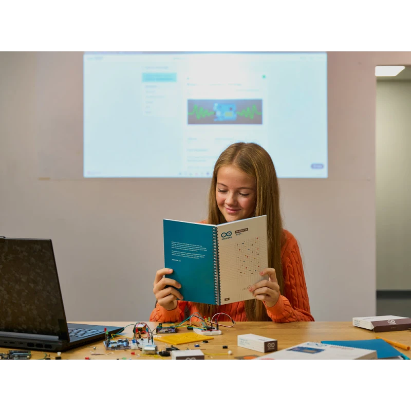 At its heart is the UNO R4 WiFi board, which delivers significantly stronger performance and built-in wireless connectivity (Wi-Fi and Bluetooth®). This allows you to build modern, connected projects right from the start. Inside the box, you will find a printed project book with 13 guided, hands-on experiments, plus all the necessary electronic components to bring them to life — from sensors and motors to displays and complex logic circuits.
