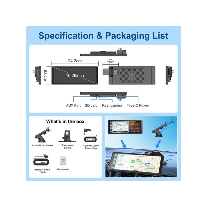 Package Contents: Multimedia Player, Car Charger, Dashboard Holder, Suction Cup Holder, Reversing Camera