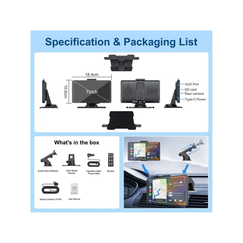 Package Contents: Multimedia Player, Car Charger, Dash Mount, Suction Cup Holder, Suction Cup Holder, Reverse Camera