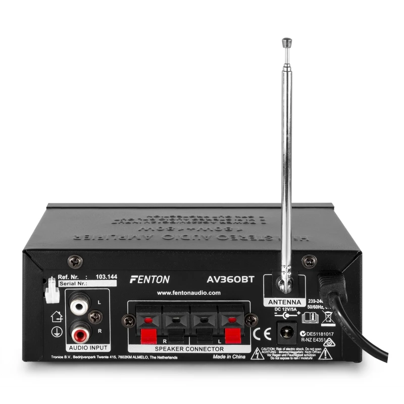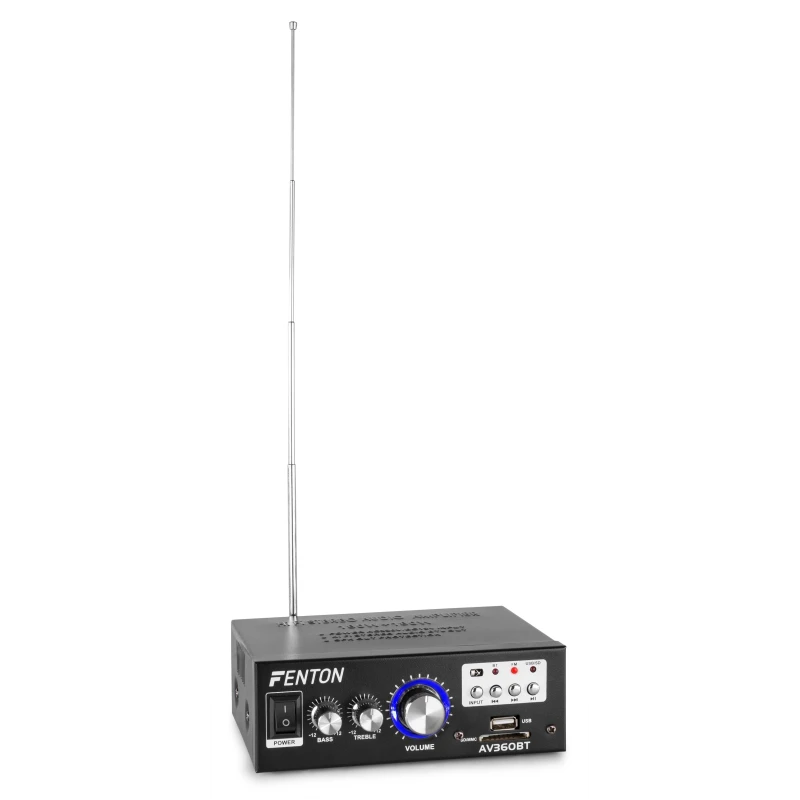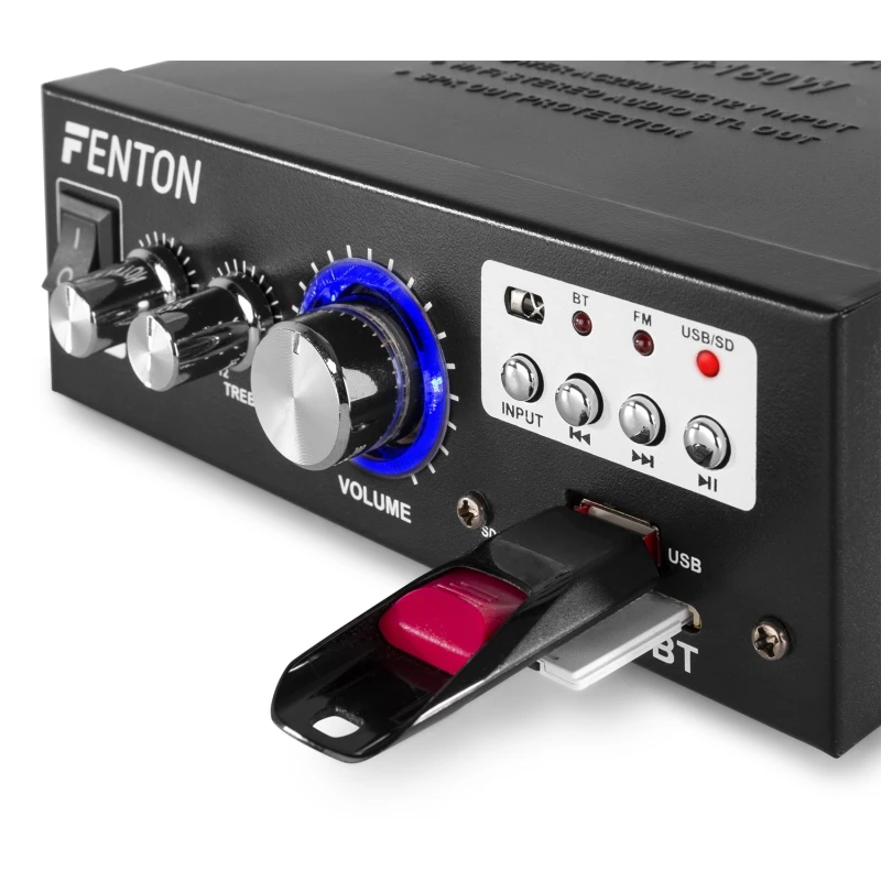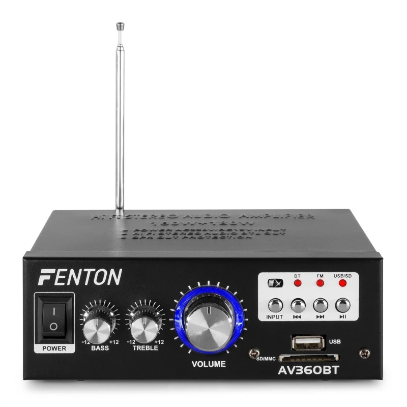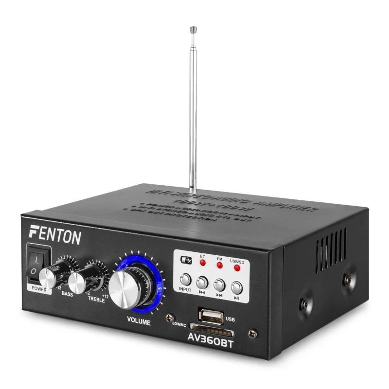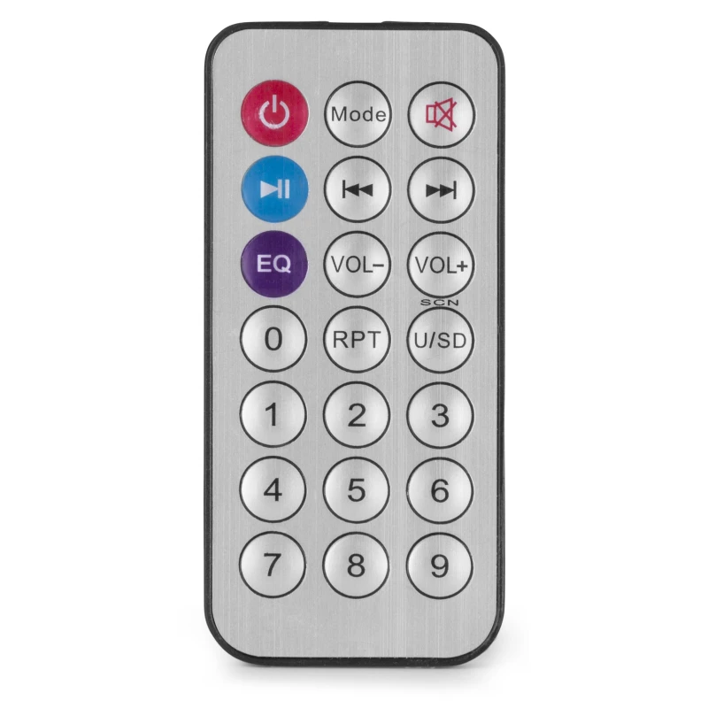 2x 40W Hi-Fi stereo audio amplifier with MP3 player, ensuring optimal listening pleasure. Even at higher volume levels, the amplifier provides high sound pressure. It features USB/SD inputs, speaker protection, remote control, and more. Includes bass and treble controls, and an external 12V DC socket.