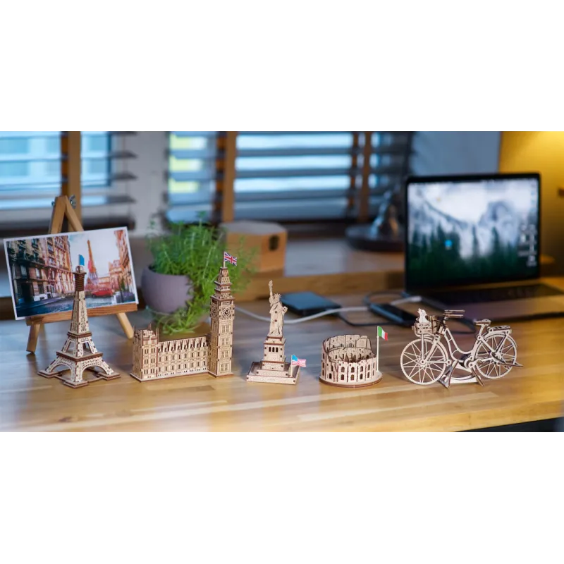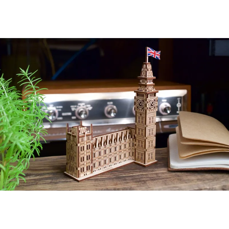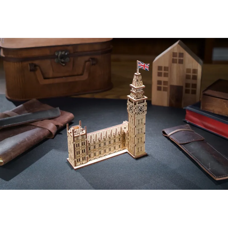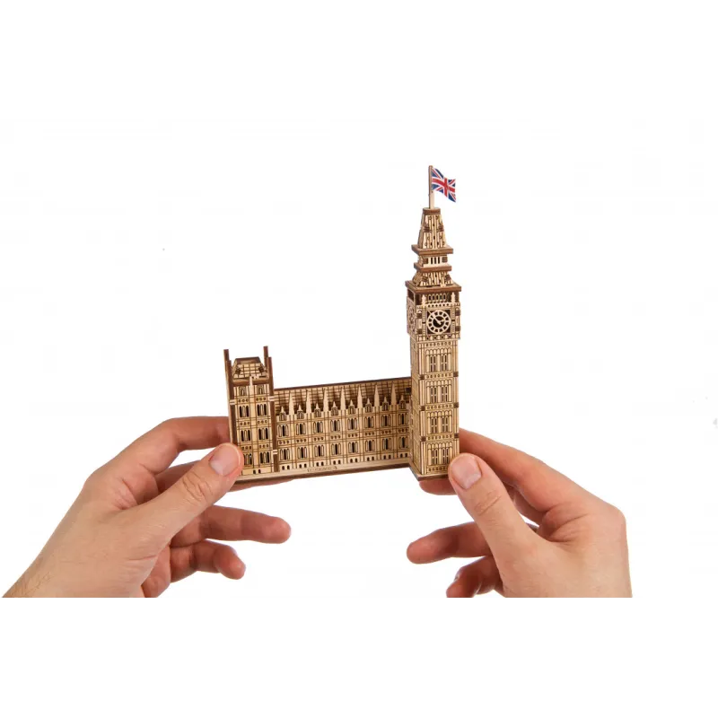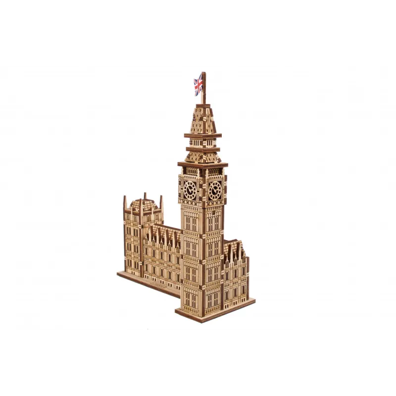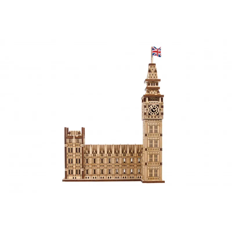 Part of the Ugears World Cities Collection, the Ugears Big Ben Model with House of Parliament Part is a 1:530 scale wooden DIY model of the iconic clock tower, measuring 137 x 181 x 66 mm. Made from 63 pieces of art-quality composite wood, Big Ben is rated "Easy" and can be built in about an hour. No glue or special tools are needed to build the model, just slide the pieces out of their pre-laser cut boards and snap them together. Illustrated instructions in 11 languages (English, German, Ukrainian, French, Polish, Spanish, Portuguese, Japanese, Italian, Chinese, and Korean) guide you through your construction. This static 3D puzzle is perfect for display on a shelf or table in your home or office.