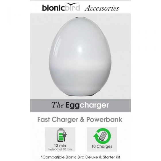 - Hybrid lithium polymer battery (800 mAh) included.- Total capacity of the egg: 10 full flights or 90 minutes of flying time.- Charging time Bird: 12 minutes (smart charging cycle “Turbo Charge®”) instead of 20min without the egg.- Egg auto power-off after 5 minutes