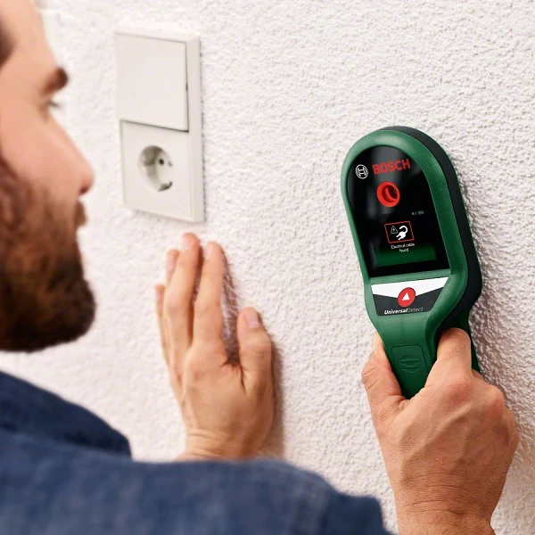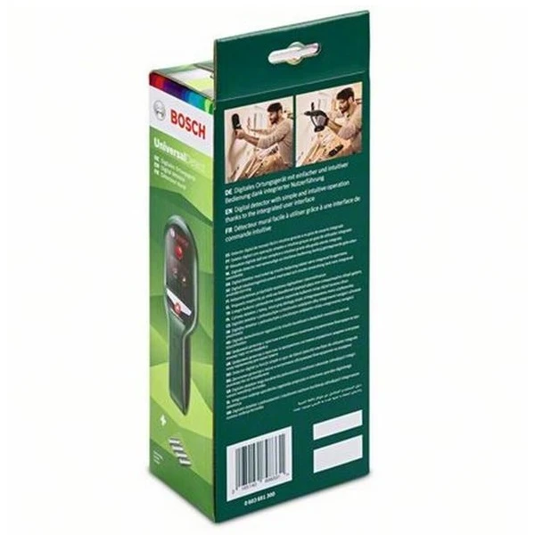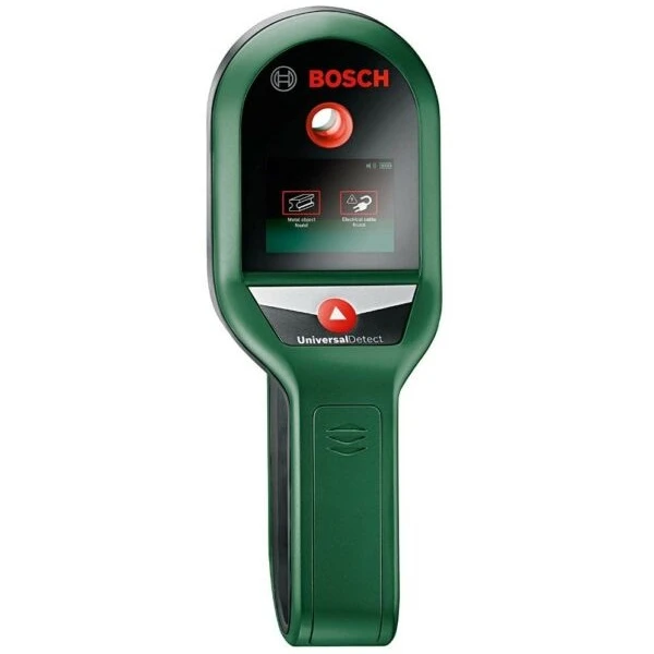 Bosch UniversalDetect is a digital detector designed for safer drilling in walls, ceilings, and floors. It detects various objects behind surfaces to prevent damage during installation tasks.
