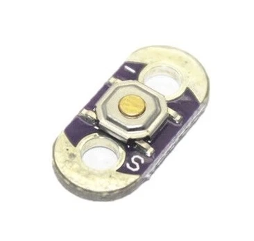 The LilyPad Button Board Module is a very discrete small momentary push button switch. The LilyPad Button Board is intended to be used with the LilyPad Arduino 328 Main Board.This button board was designed to be low profile, without any sharp edges, and to be sewn onto fabric as a discrete button switch.