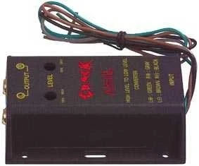 This 2-channel high-to-low level converter (CAR-AX03) allows connection of an amplifier with RCA inputs to a radio using only speaker wire outputs.