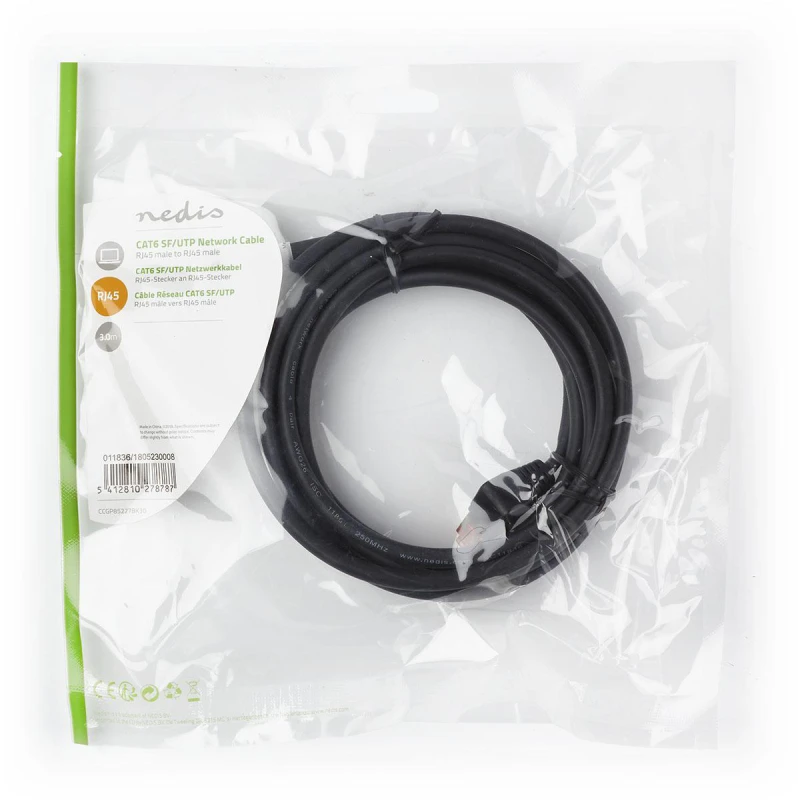CAT6 Patch ethernet cable straight and corner plug 3m, S/FTP gigabit LSZH PiMF, Black