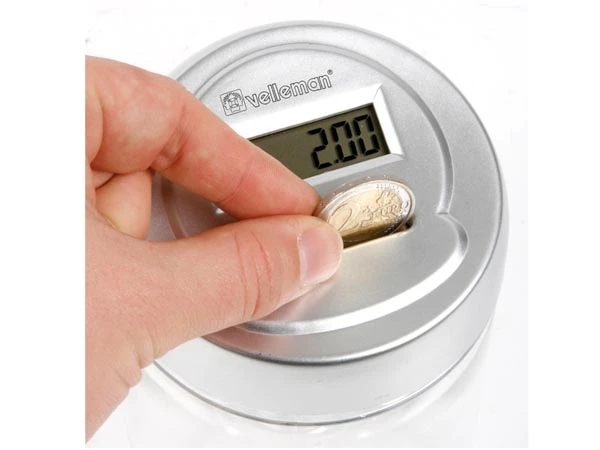 This convenient money box is equipped with a coin counter that recognizes Euro coins by their size. The counter accurately displays the total amount of money in the box. Power supply: 2 x AA batteries.