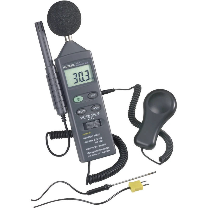 4 in 1 Multifunction Environment Meter The 4 in 1 digital Multifunction Environment Meter has been designed to combine the functions of Sound Level Meter , Light Meter , Humidity Meter , and Temperature Meter . It is an ideal Multifunction Environment Meter Instrument with scores of practical applications for professional and home use.