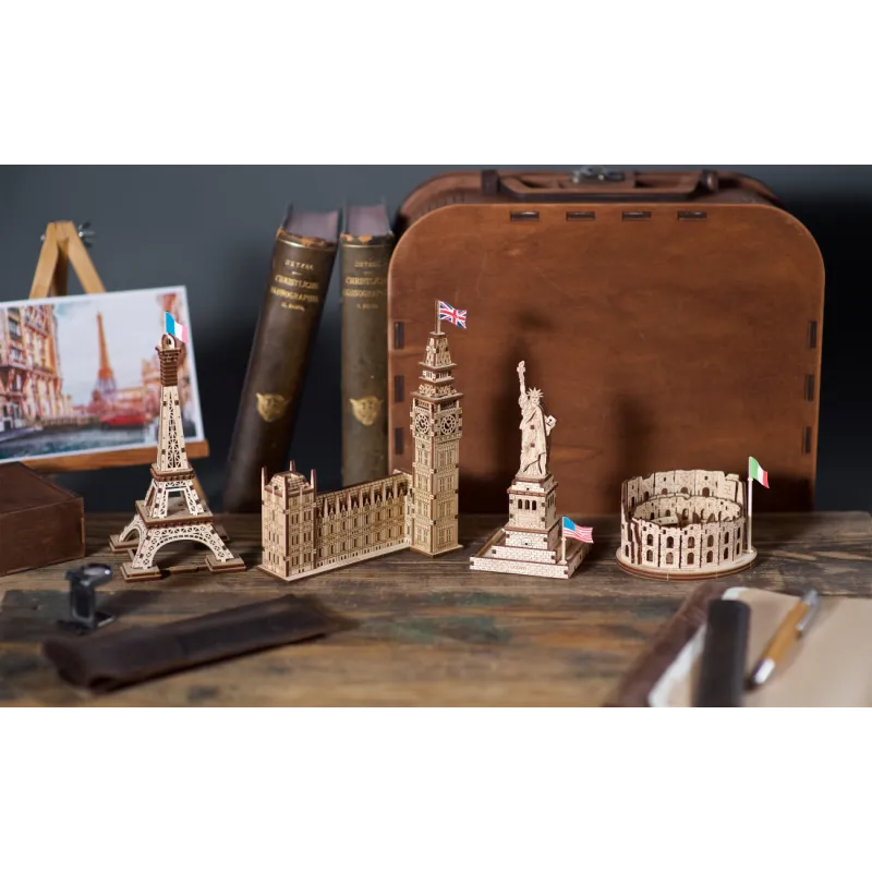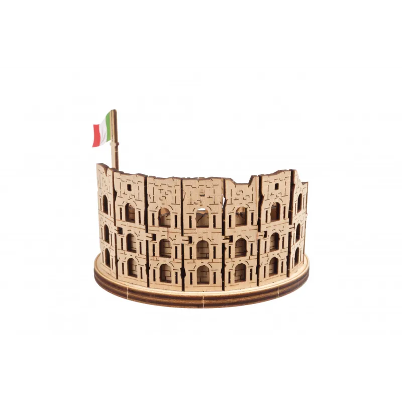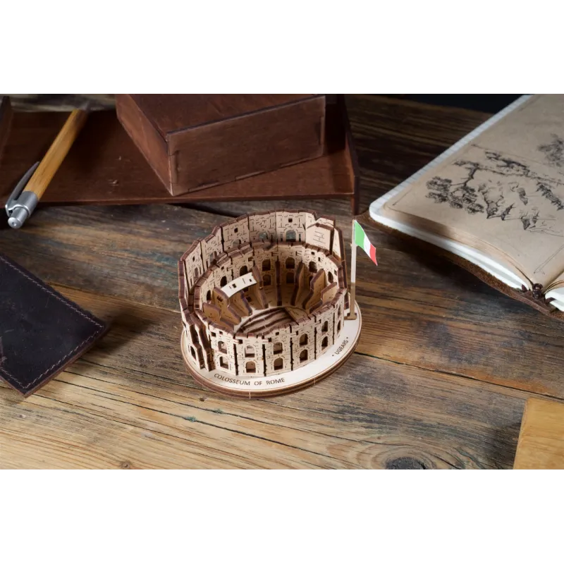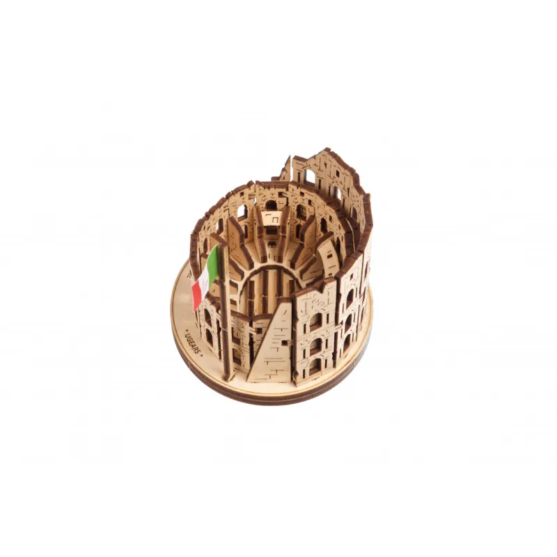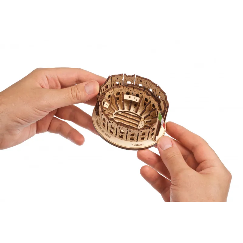The Ugears Colosseum Model from the World Cities collection is a 1:1000 scale DIY wooden model of the iconic Amphitheater, measuring 100 x 75 x 85mm. With 63 parts made of composite wood, the Coliseum is rated "Easy" and can be built in about 30 minutes. No glue or special tools are needed to build the model, just slide the pieces out of their pre-laser cut boards and snap them together. Illustrated instructions in 11 languages (English, German, Ukrainian, French, Polish, Spanish, Portuguese, Japanese, Italian, Chinese, and Korean) guide you through your construction. This static 3D puzzle is perfect for display on a shelf or table in your home or office.