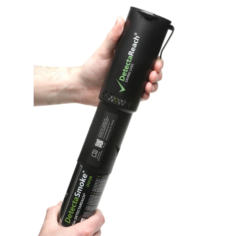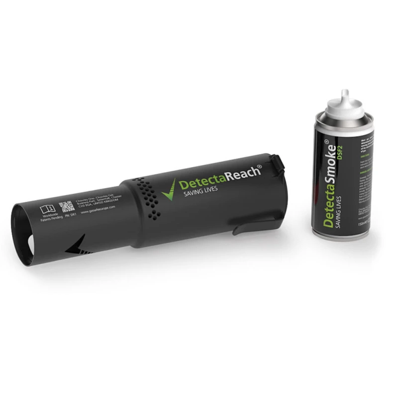 The DetectaReach® DR1 is a 150 ml aerosol spray designed for the functional testing of smoke detectors. It features a specialized directional nozzle that ensures precise delivery of test smoke to the sensor area, facilitating efficient fire safety maintenance and inspections.