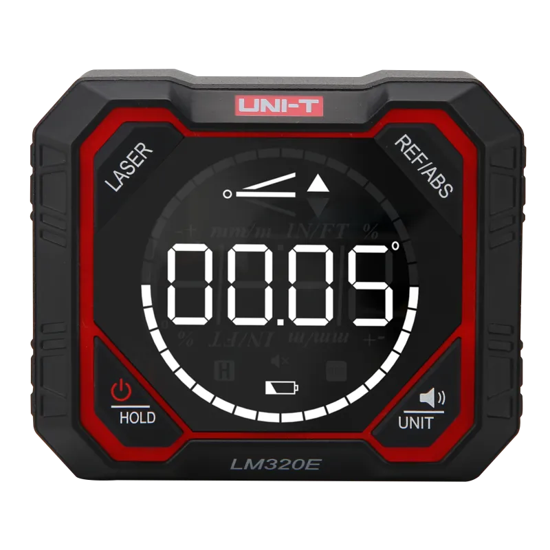 The UNI-T LM320F is a professional digital inclinometer housed in a compact, durable aluminum alloy body, designed for high-precision angle measurements across a full 4×90° range. This versatile tool combines digital accuracy with integrated laser functionality to streamline layout and leveling tasks.