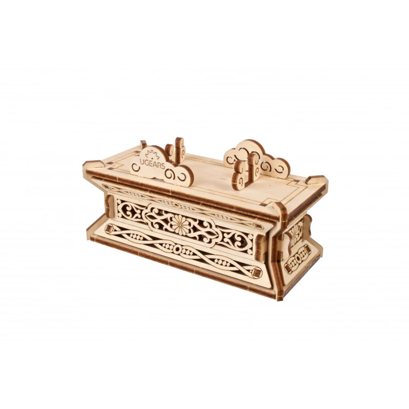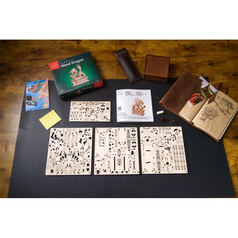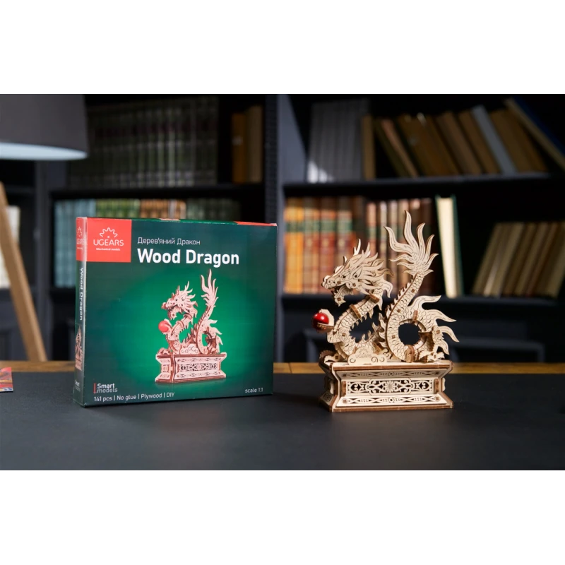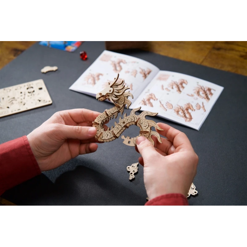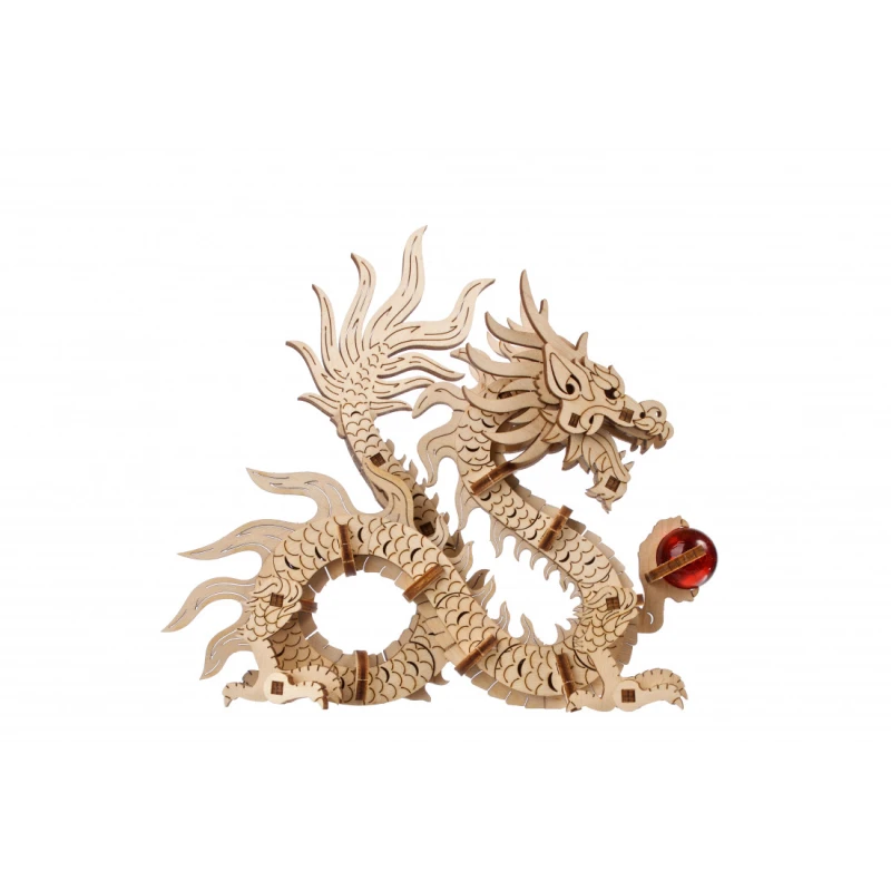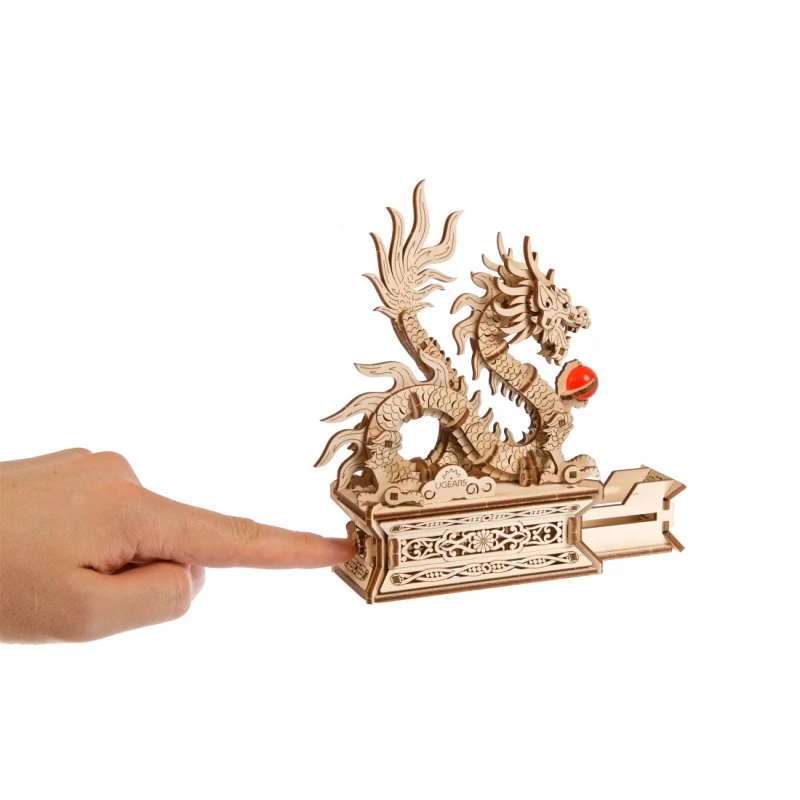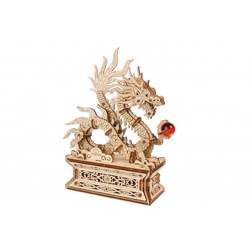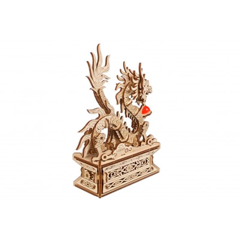 Ugears Wooden Dragon is a 3D puzzle box and craft model of a happy dragon holding a fiery red gem in its left claw. A long coiled four-legged wooden dragon, modeled after the depiction of dragons in Chinese art, sits on a special base with a hidden drawer that opens when you press a secret button disguised as a flower (the drawer closes manually). The dragon is completely removable and can be stood, on any surface and admired from a separate stand. A secret message, a prophecy or a small treasure can be hidden inside the base.