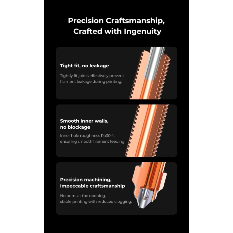 - Precision Engineering: Features ultra-smooth internal walls (Ra < 0.5) to prevent filament leakage and minimize clogging, ensuring consistent print quality.