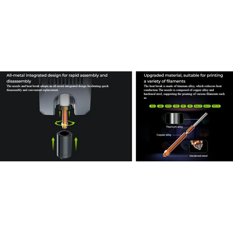- Titanium alloy heat break minimizes thermal conduction, improving print stability.