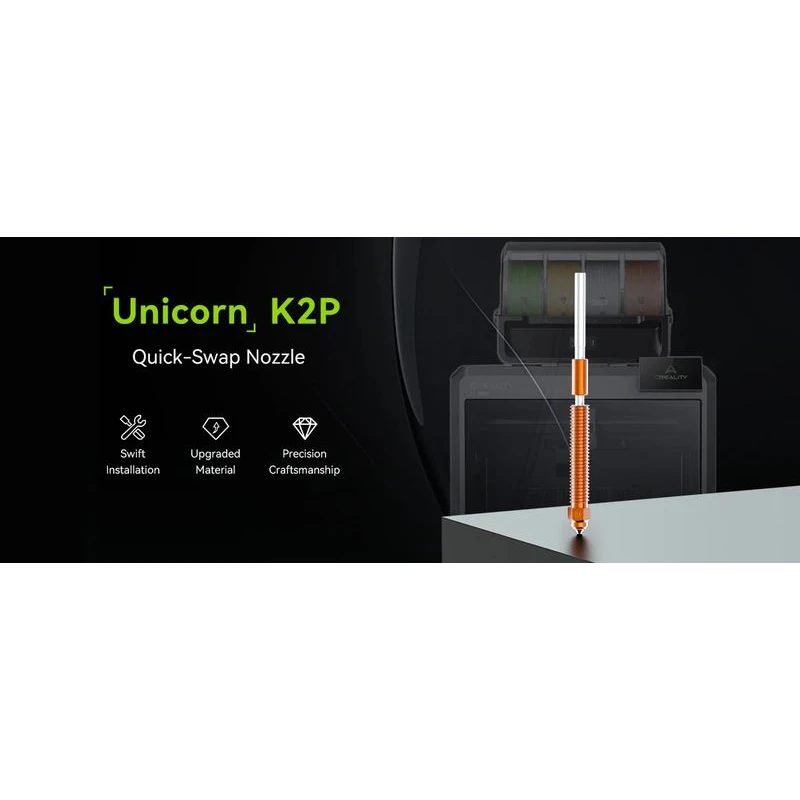 The Creality Unicorn K2P Quick-Swap Nozzle is a high-precision, tri-metal component designed specifically for Creality K2 Plus and Creality Hi 3D printers. Featuring a 0.4 mm diameter, this nozzle utilizes an innovative tool-free Quick-Swap mechanism to ensure rapid replacement and minimal machine downtime.