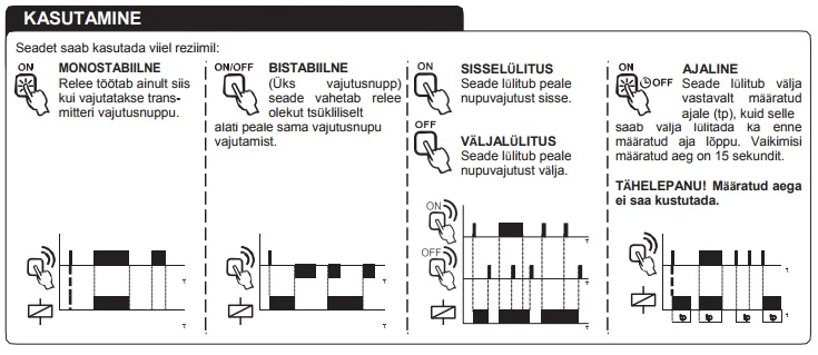 * 5 operating modes - switching on, switching off, monostable, bistable, and timed (delayed shutdown)