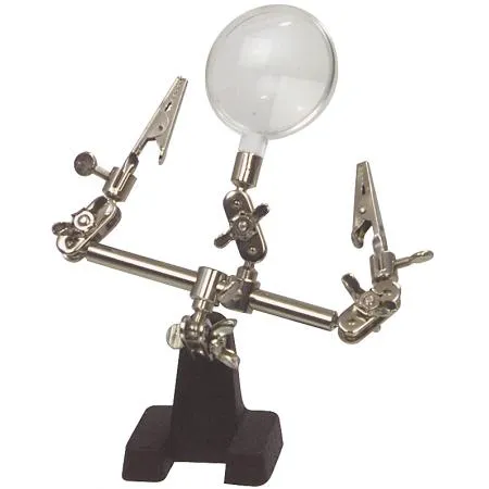 A helping hand for soldering and other small tasks, featuring a magnifying glass and two holders.