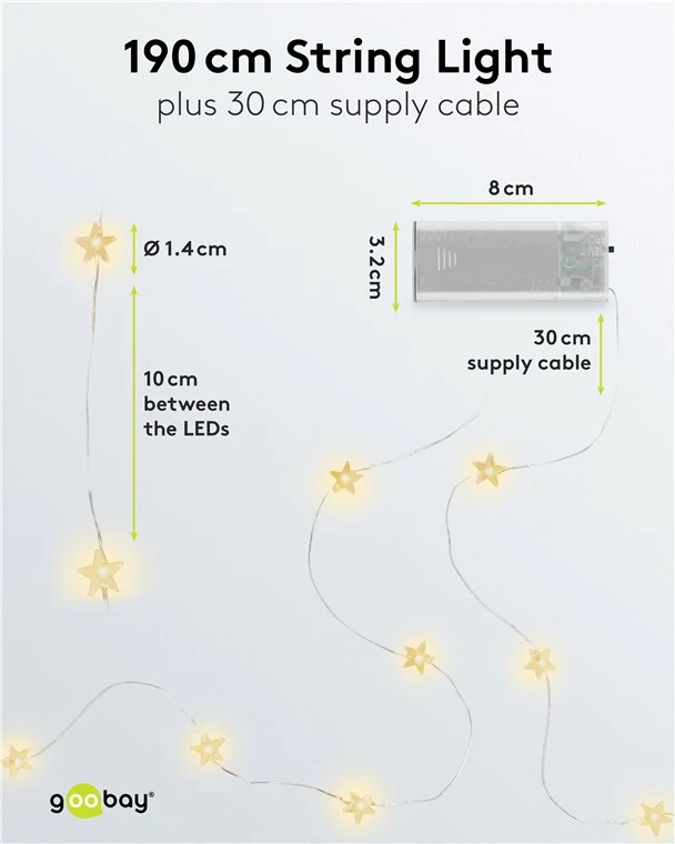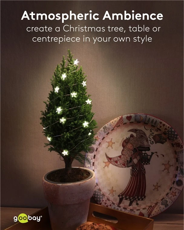 This Goobay "Stars" LED string light (SKU: 60332-GBY) features 20 warm white LEDs mounted on a flexible silver metallic wire, designed for easy integration into indoor decorative arrangements.