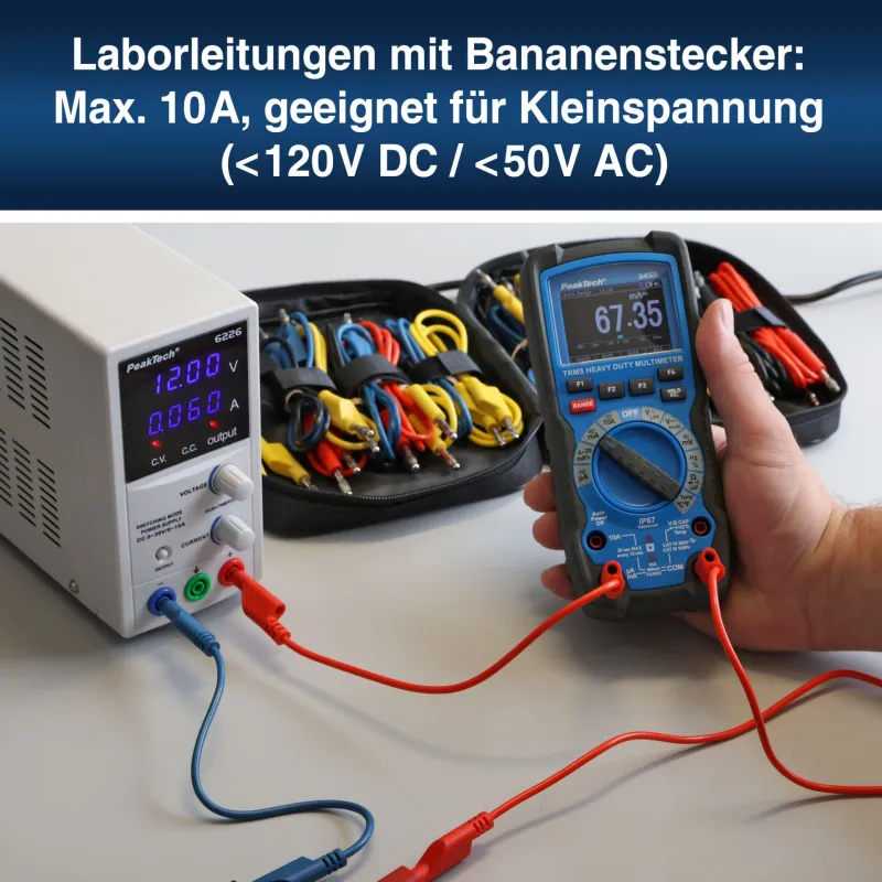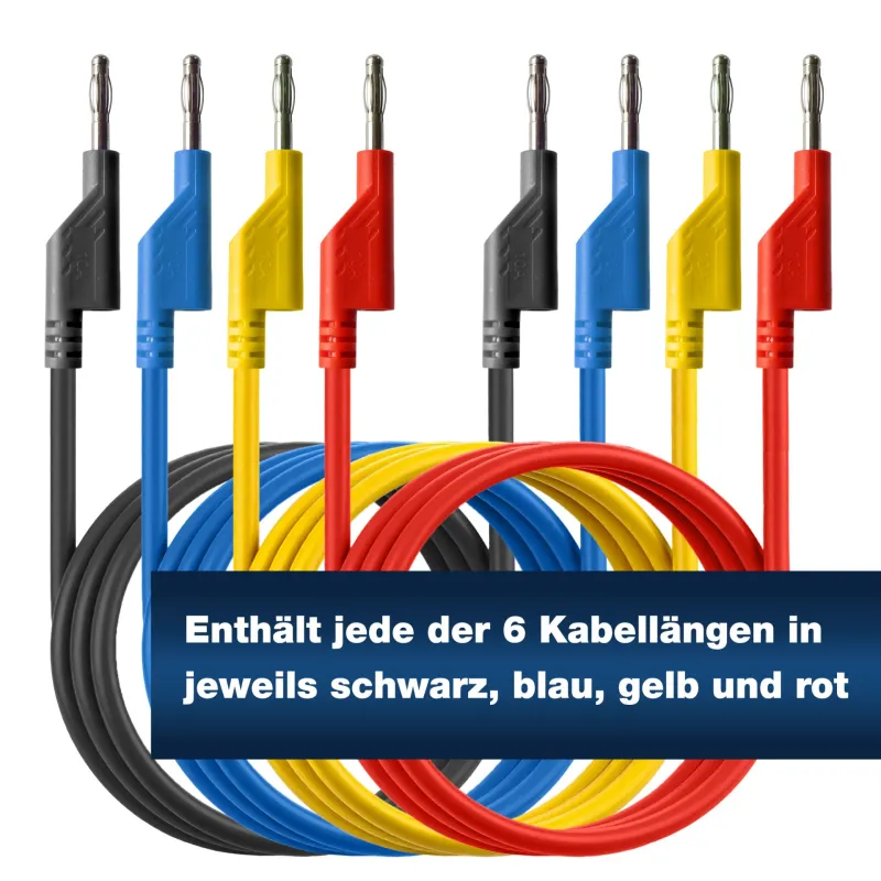 With its wide range of cable lengths and stackable connectors, this set is well-suited for professional laboratories, educational institutions, and electronics hobbyists. It is specifically designed for use with laboratory power supplies and training stands where maintaining an orderly and identifiable workspace is critical.