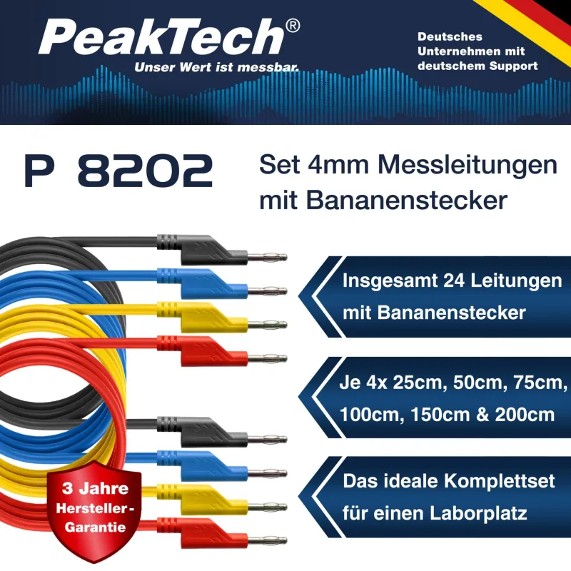 The PeakTech P 8202 (PT8202-ET) is a comprehensive 24-piece laboratory cable set designed for reliable connections with power supplies and educational test stands. This kit facilitates organized circuit building through a versatile selection of lengths and color-coded leads.
