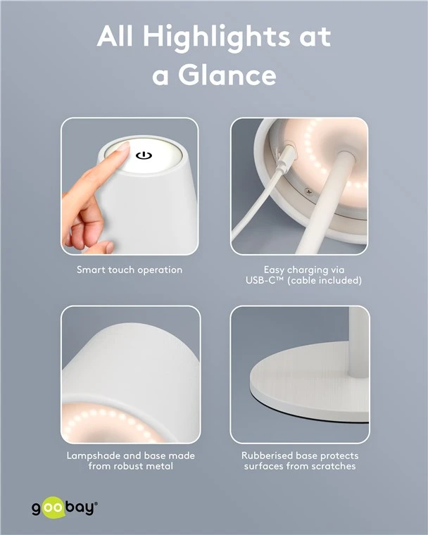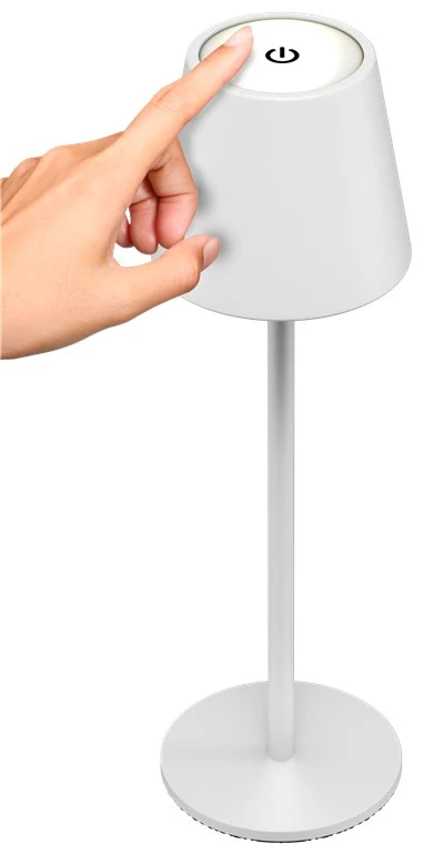 Wireless LED table lamp, white. With touch-sensitive control, 180 lm, warm white (3000 K), stepwise dimmable.