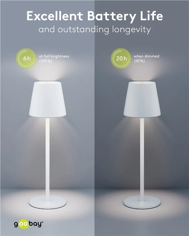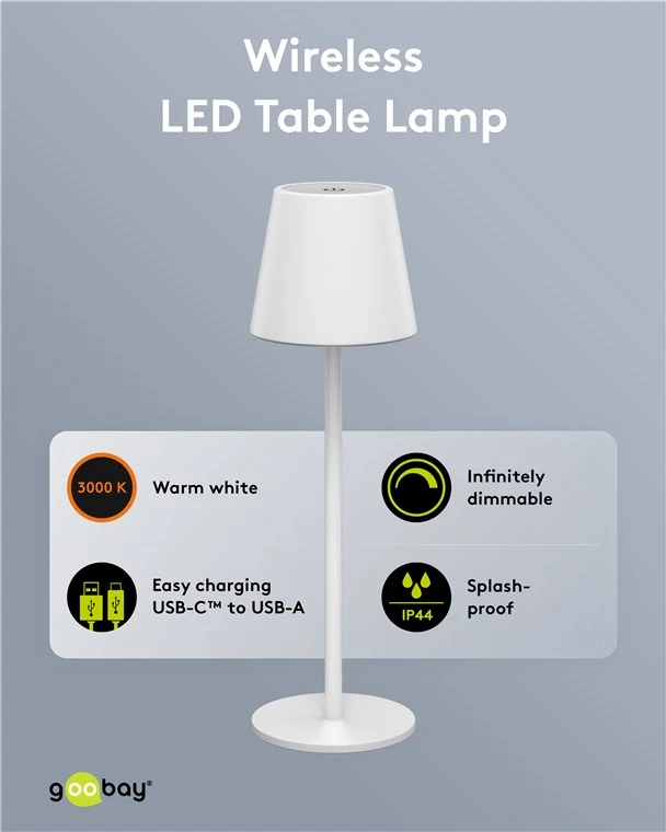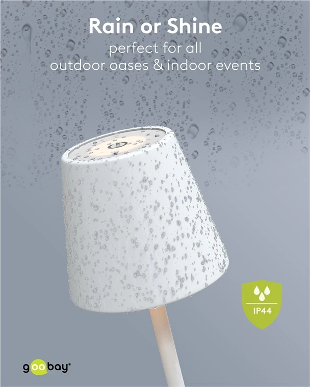 Thanks to splash water protection (protection class IP44), the table lamp is also perfect for the terrace, balcony or garden.