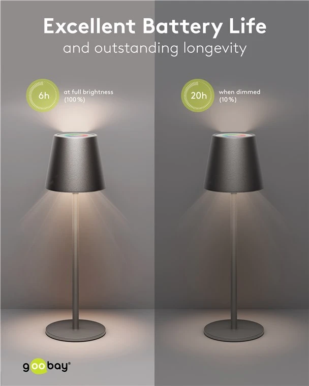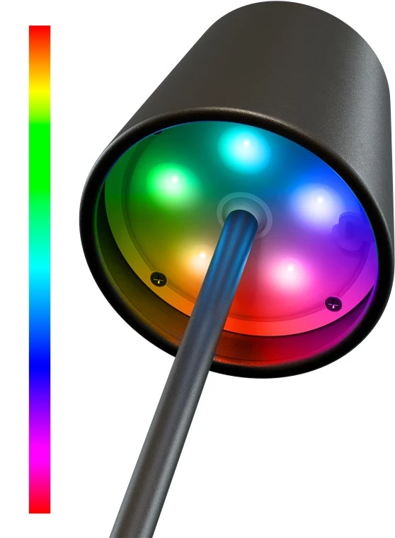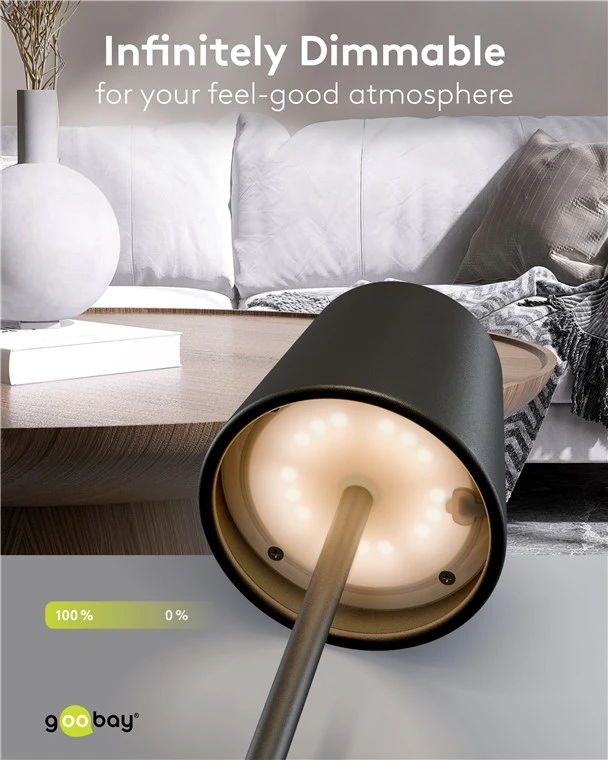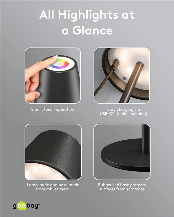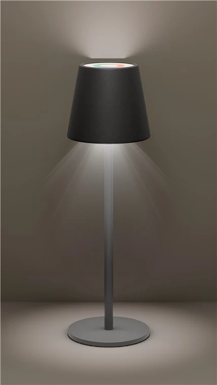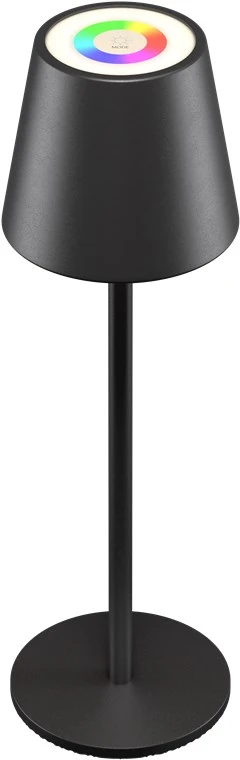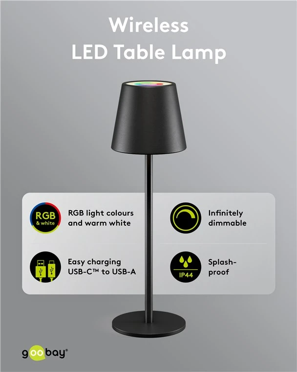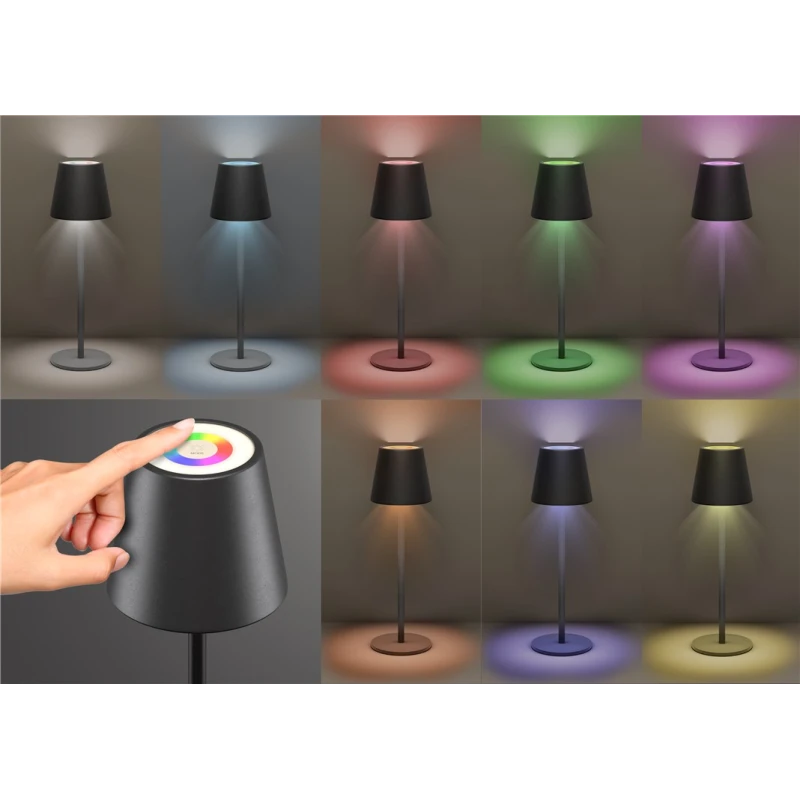 Wireless LED Table Lamp RGBW, black, with touch control, 150 lm, various RGB light colors, and warm white (3000 K), dimmable. The minimalist Scandinavian design enhances any living room, bedroom, or dining area and adds a stylish touch to garden parties.