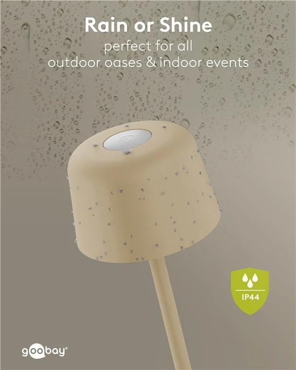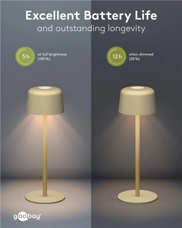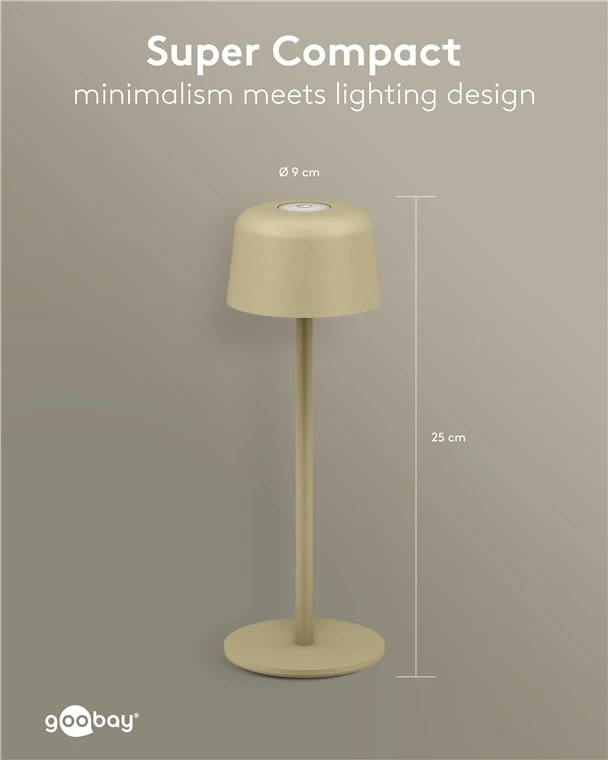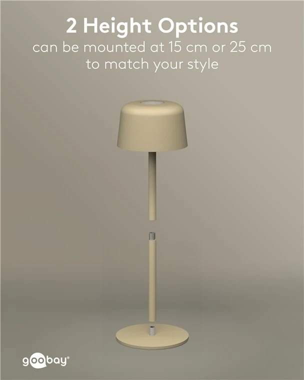 The Goobay Wireless LED Table Lamp (Size S) in beige is a portable lighting solution featuring an elegant Scandinavian design and a robust metal construction. This modular lamp offers adjustable height and cordless operation, making it a versatile addition to both interior and exterior spaces.