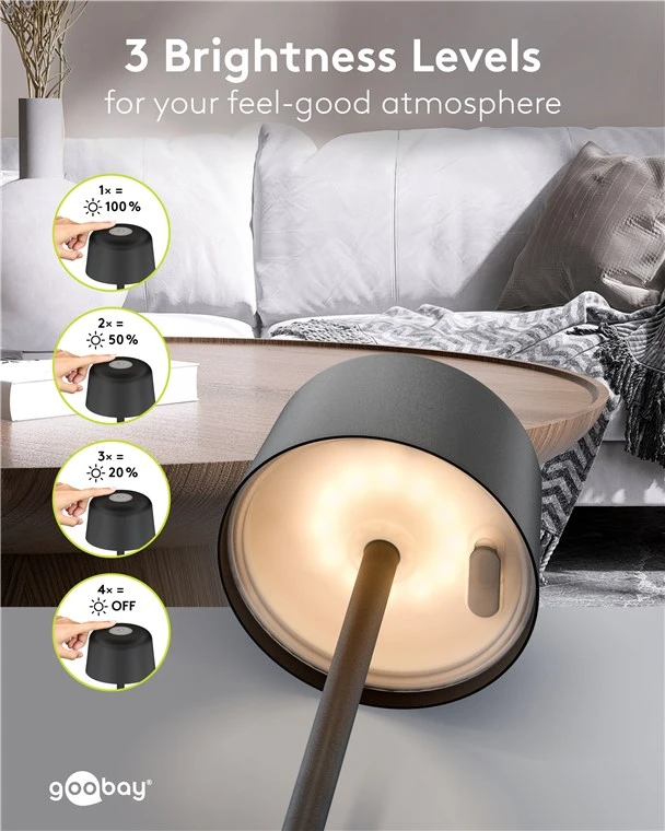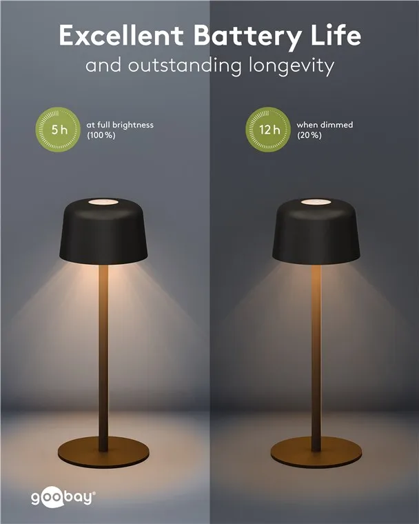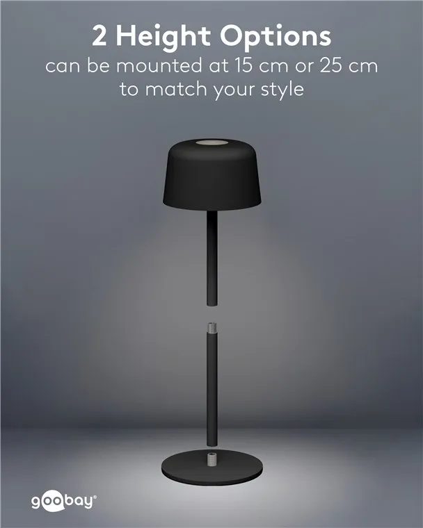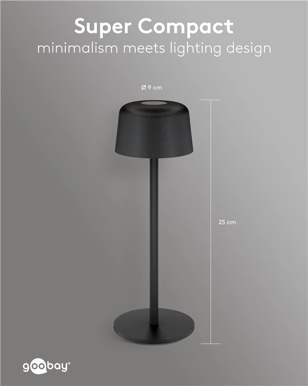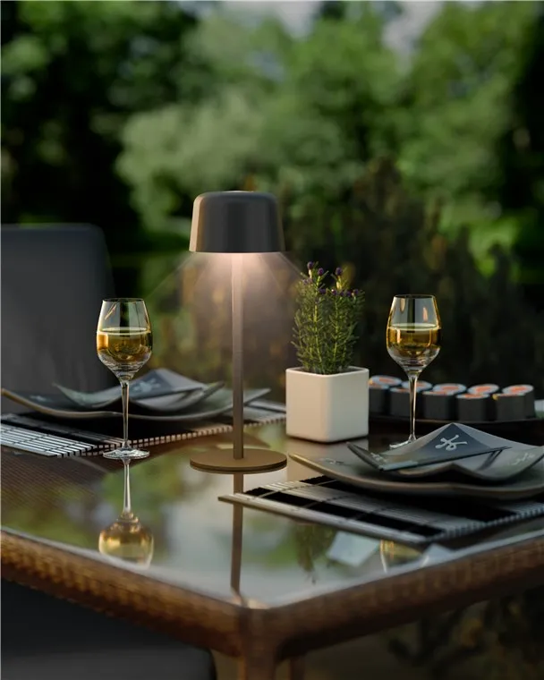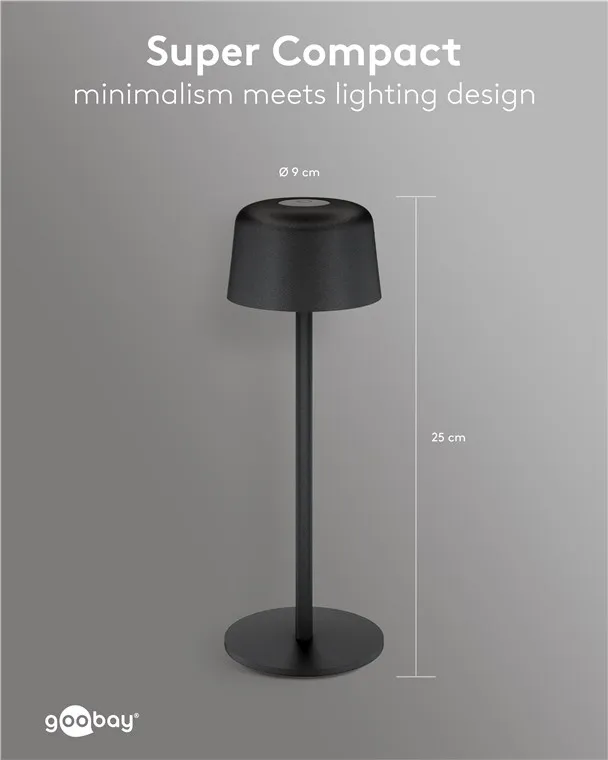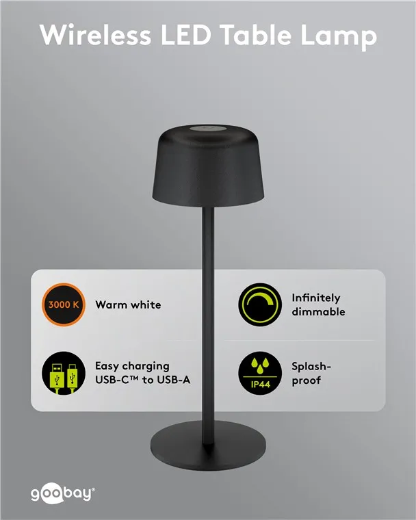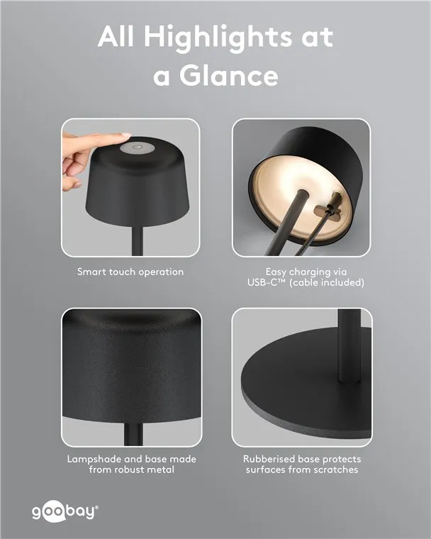 Key Features Equipped with a modern USB-C port, the lamp offers convenient charging for its integrated battery. Its IP44 rating ensures reliable protection against splashes and solid objects, making it suitable for both indoor use and sheltered outdoor spaces. The compact and functional design allows for easy placement on tables, desks, or patios without the constraints of a power cord.