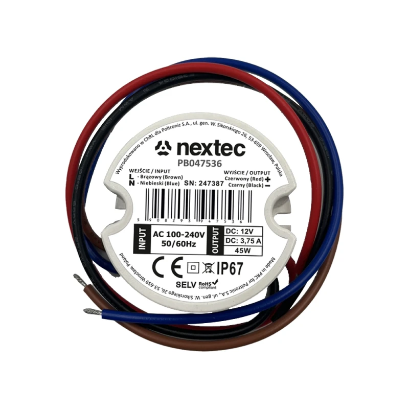 This round AC/DC power supply, SKU PB047536, is designed to convert mains voltage into stable 12V DC power, providing up to 45W and 3.75A.