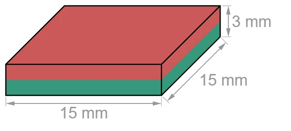 This high-performance Neodymium block magnet (N45 grade) measures 15 x 15 x 3 mm and is designed for compact applications requiring significant holding power.
