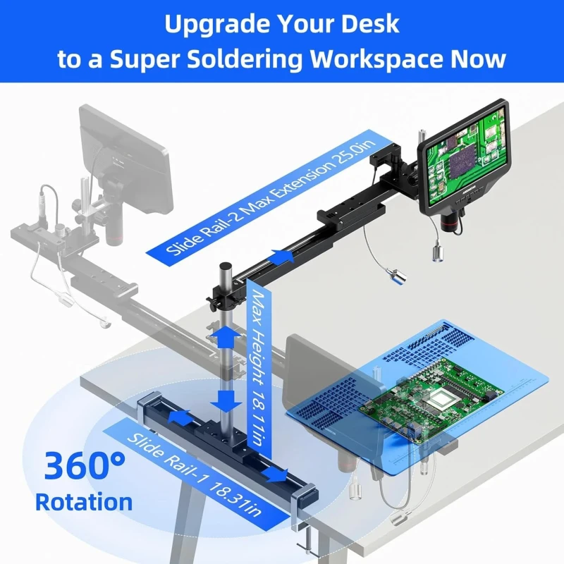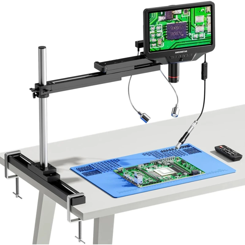 The Andonstar AD409SA is a 2025 newly upgraded digital microscope featuring an innovative Slide Rail Arm Stand. This professional setup provides a massive working area of up to 25″ x 18.3″ x 18.1″, offering a 720% increase in workspace compared to previous models. It is specifically designed to accommodate large PCBs and multiple tools, ensuring you never feel cramped during precision work.