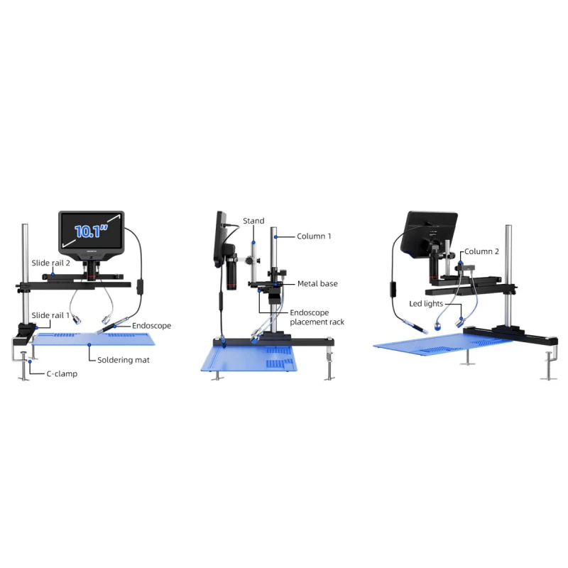 Package contents: Microscope monitor, UV filter, Soldering mat, Slide Rails, LED Lights, Columns, Base, Stand, C-clamps, Endoscope, Remote, Power Adapter/Cables, HDMI Cable, USB Cable