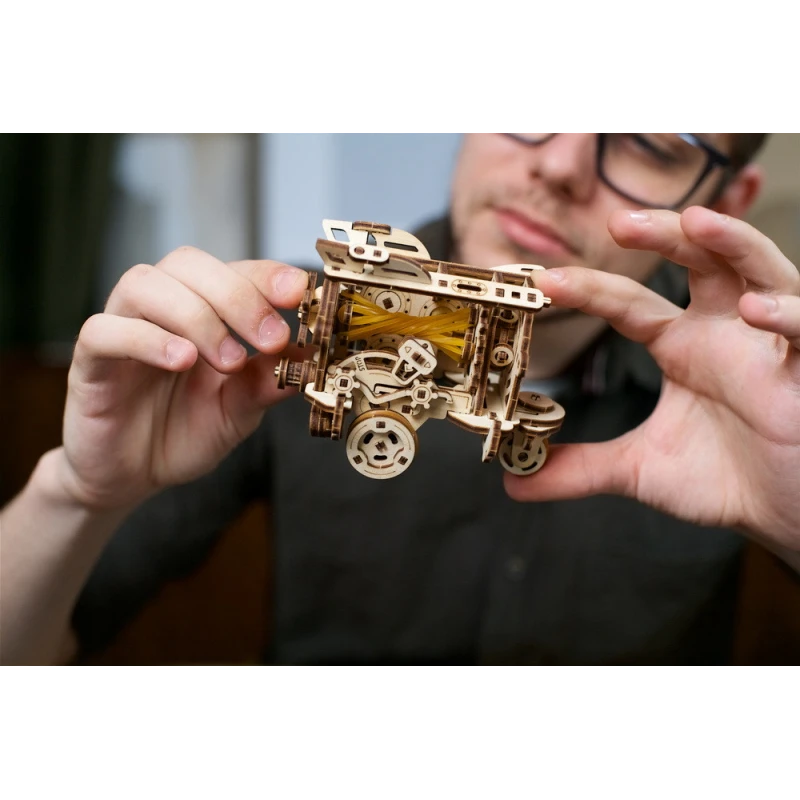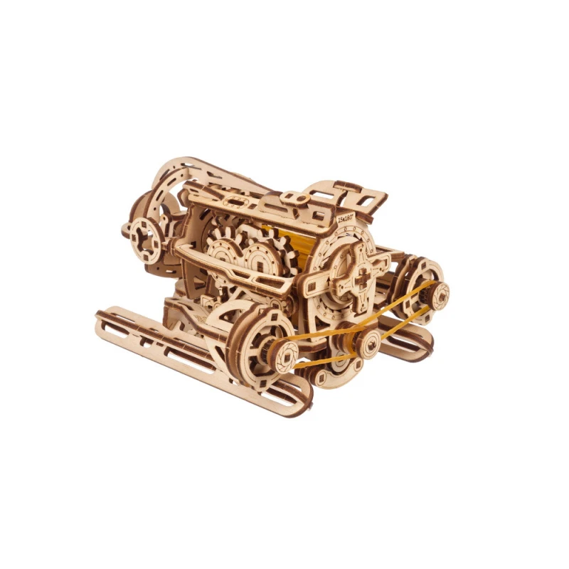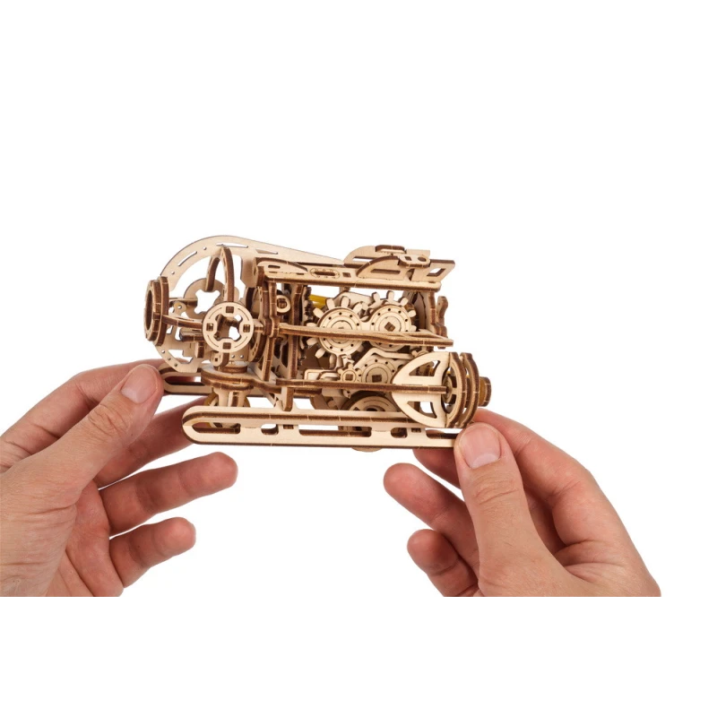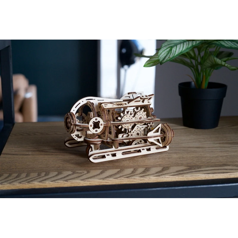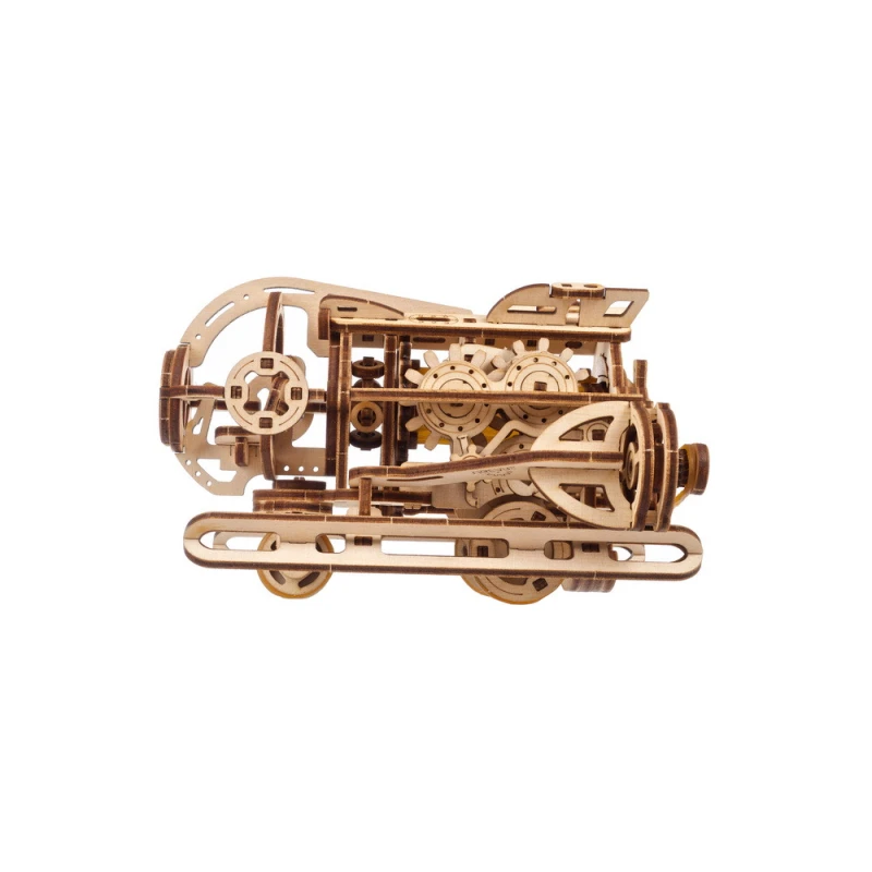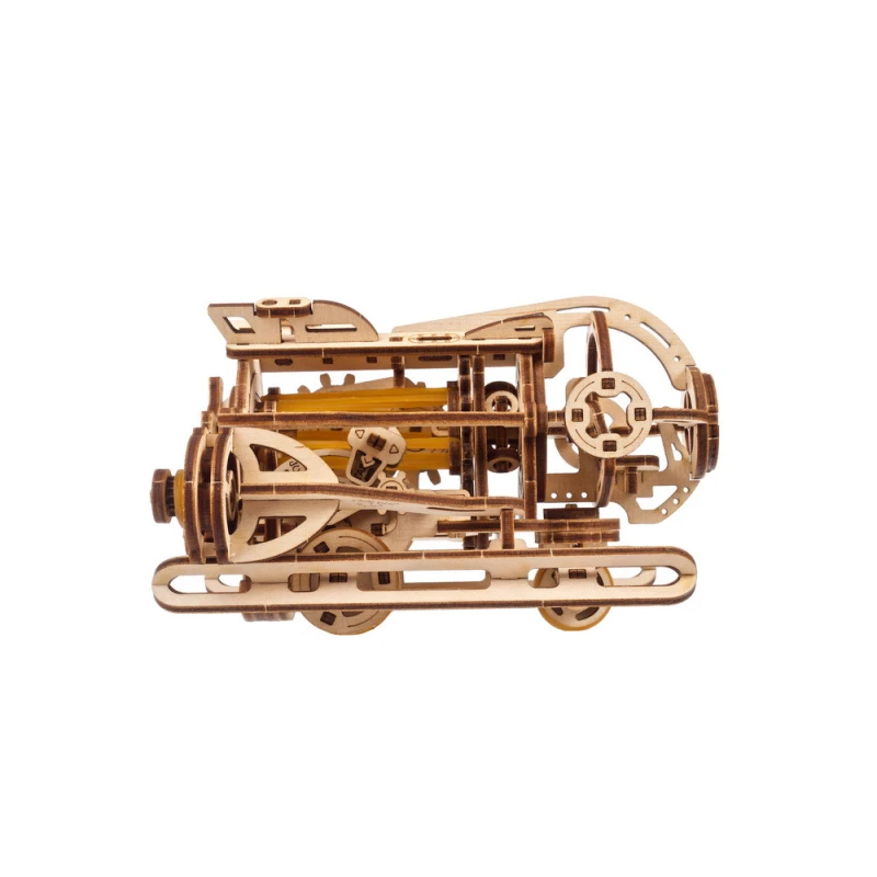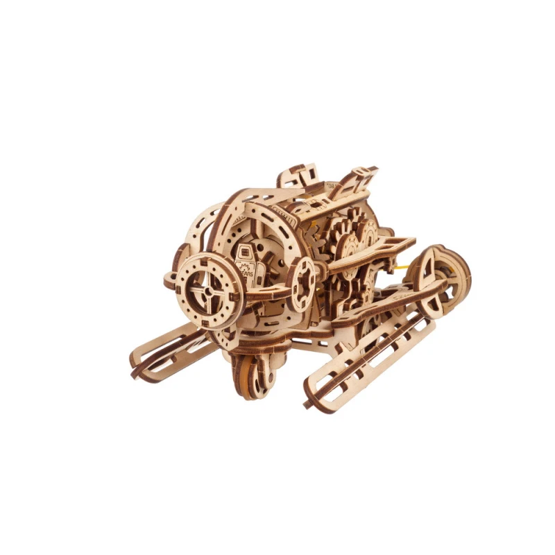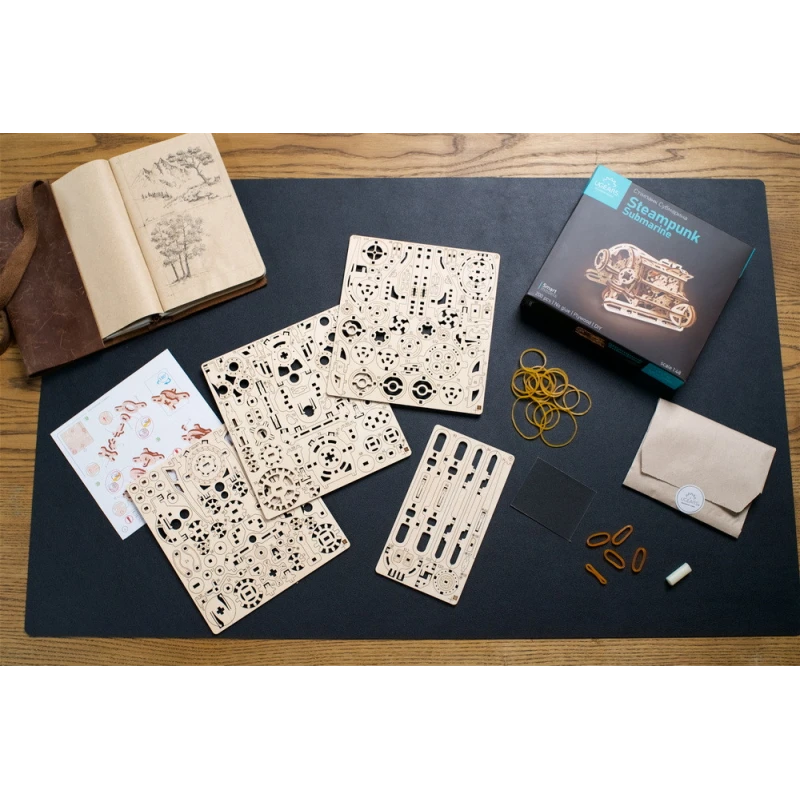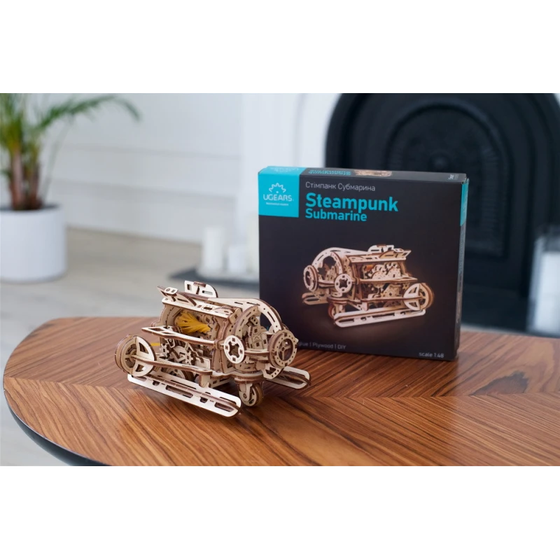 The DIY Steampunk Submarine by Ugears is part of our "SMART" product line—an intermediate category of mechanical models, somewhere between Mini and Standard models in terms of complexity. Like all Ugears models, the SMART Steampunk Sub is made of attractive art-quality composite wood, with laser pre-cut pieces for ease of assembly. With only 200 parts, even beginner to intermediate modelers can assemble it in a few hours. No glue or special tools are required for assembly—just snap the pieces together following the illustrated instructions that come with the kit (in English, German, Ukrainian, French, Polish, Spanish, Portuguese, Japanese, Italian, Chinese and Korean language). You can leave the sub in its natural wood state or paint or stain it in a color of your choosing, even yellow!