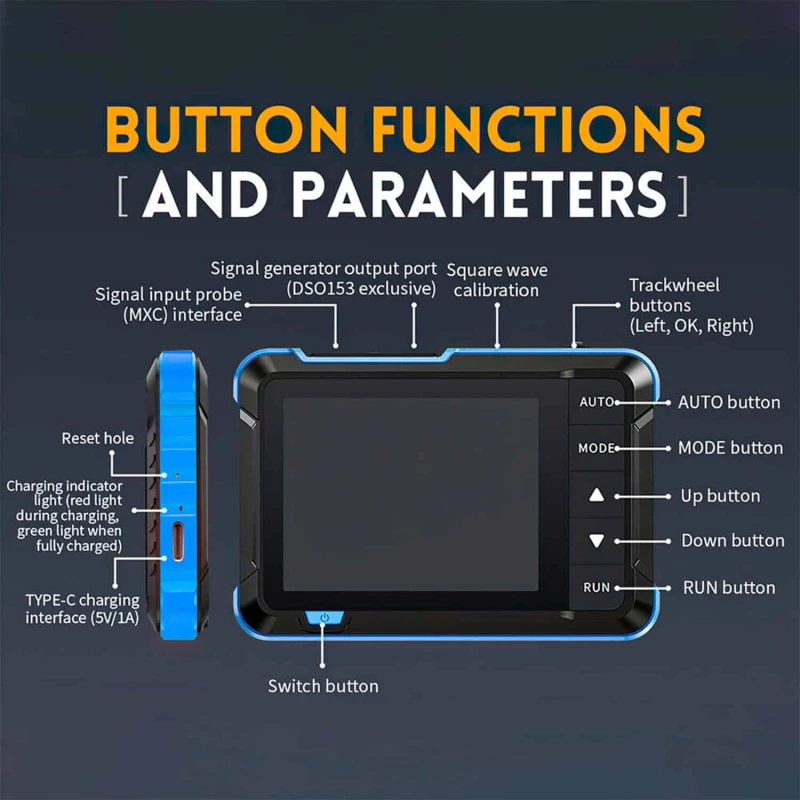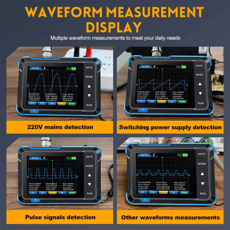 The integrated signal generator can output 14 different waveforms, including sine, square, and sawtooth waves with frequencies up to 10kHz. Powered by a built-in 1000mAh lithium battery, the device provides up to 4 hours of continuous use on a single charge and supports convenient Type-C charging.