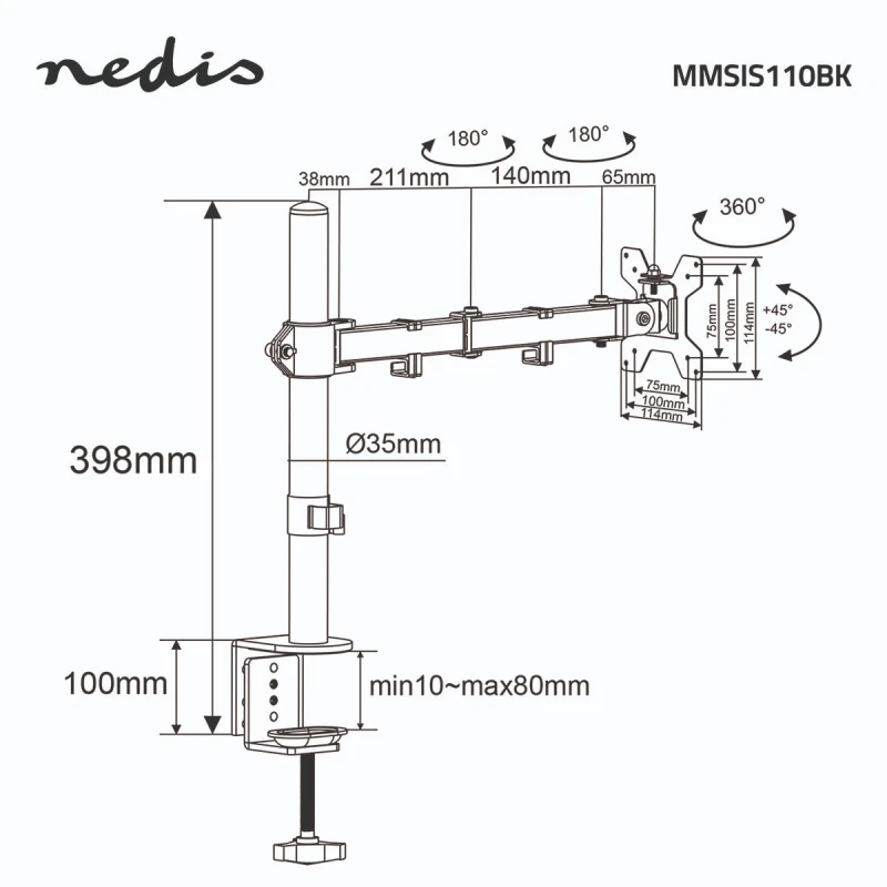 This Nedis monitor desk mount fits up to a 32-inch flat screen, offering versatile tilt (50°), swivel (360°) and swivel (180°) options so you can easily change your screen viewing angle. Thanks to the table clamp installation method, it is quick and easy to attach, saving space.