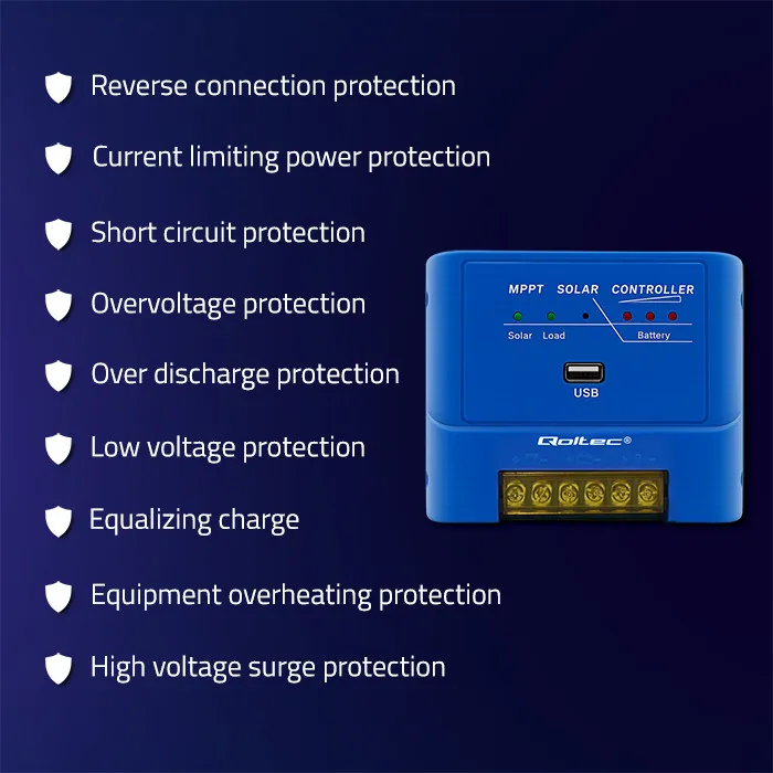 Safety is integrated into every aspect of the design. The controller is equipped with advanced protection mechanisms against short-circuits, overheating, overloading, and reverse polarity. Additionally, a built-in USB port allows for convenient charging of mobile devices, while the robust construction ensures reliable performance in temperatures ranging from -35°C up to +55°C.